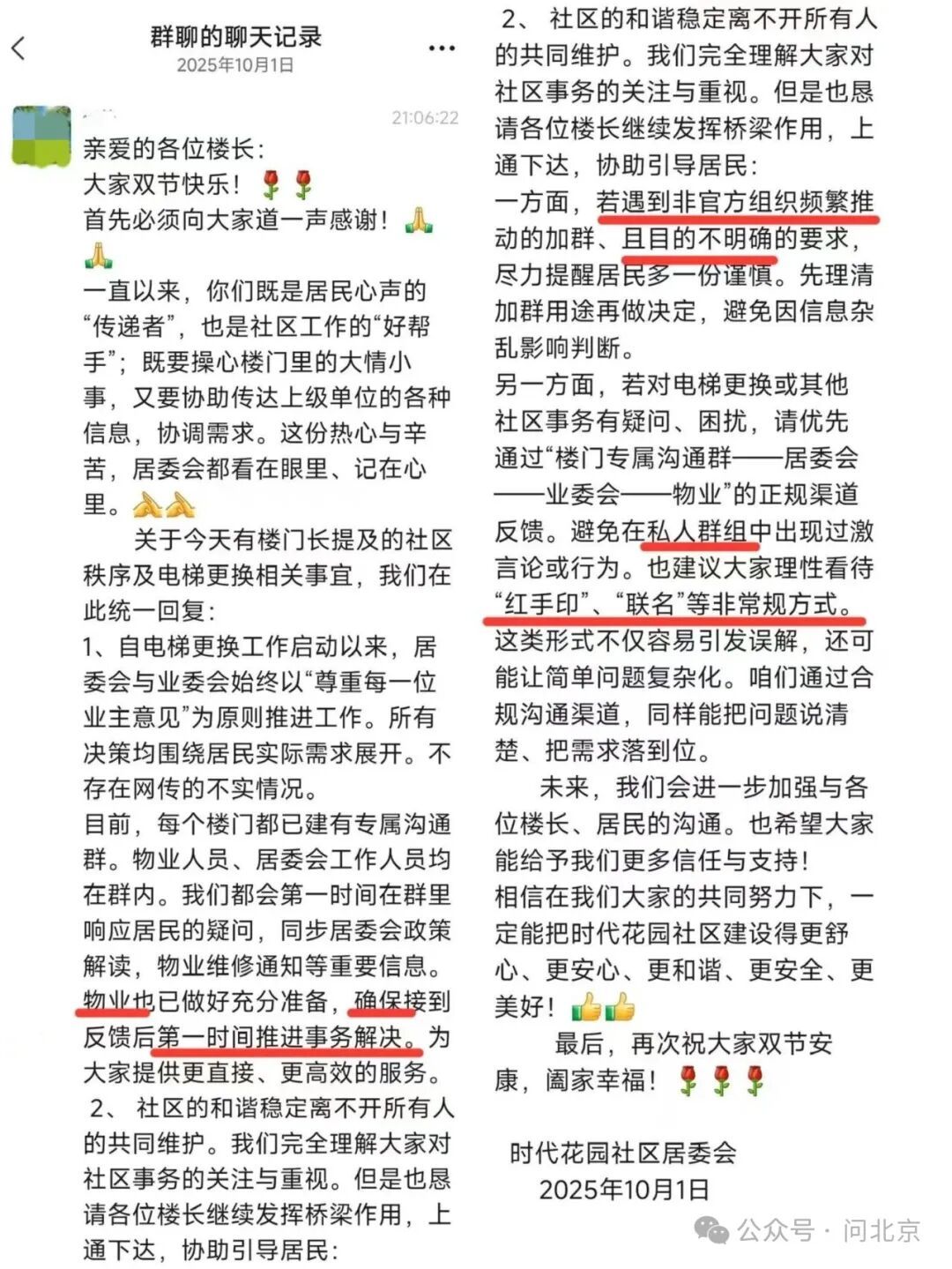 时代花园社区居委会10月1日在微信群中统一回复称,自电梯更换工作启动以来,居委会与业委会始终以“尊重每一位业主意见”为原则推进问题,所有决策均围绕居民实际需求展开,目前每个楼门都已建有专属沟通群,在群里响应居民的疑问。