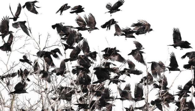 正当我欣赏这壮观的一幕时,“嗵”的一声枪响了,一树乌鸦纷纷惊起,展翅飞上空中。有几只乌鸦刚刚飞起又跌落了下来,它们中枪了。我知道,这种鸟枪里装的是铁砂,散射出去打击面非常大。我急速跑到树下看,眼前的景象一片狼藉,死亡和受伤的乌鸦竟有十二三只之多,血流满地,有的乌鸦还在地上抽搐,有的扑棱着试图飞起。我走到一只正在垂死的乌鸦前,它睁着两只眼睛死死地盯着我。这时我突然发现,乌鸦的眼睛并不全是乌黑的,而是乌黑中泛着血红。我霎时明白了,这是一种愤怒,是一种对无故射杀它们的人类的仇恨。