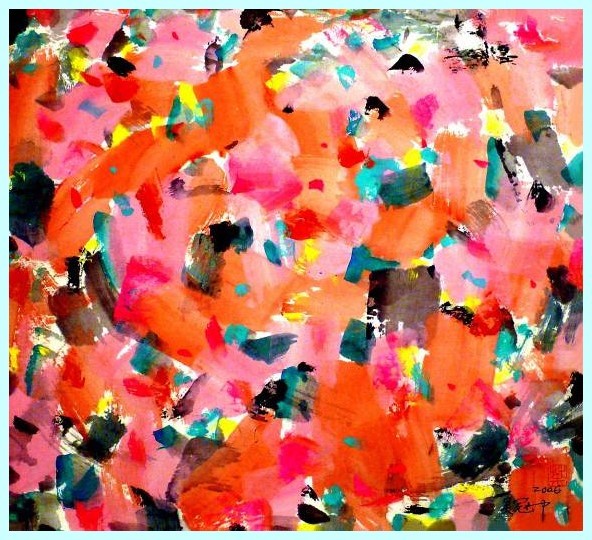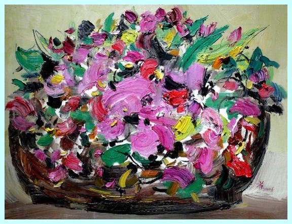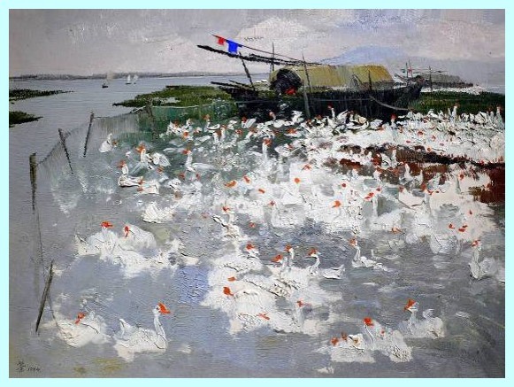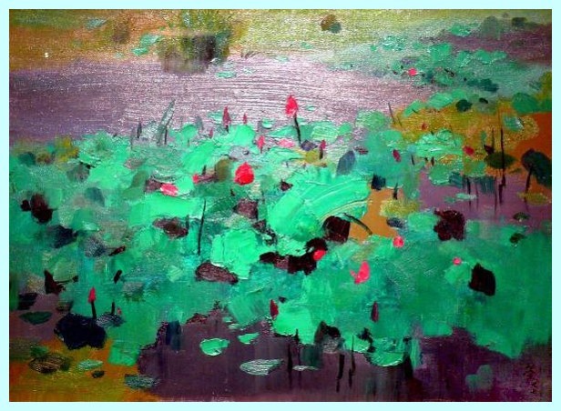 在这幅油彩红莲中,情绪突然平息下来,静观水上红莲,绿叶红花,正是市民们游园所见之美,无印象派的笔与色的颤动。淡妆浓抹,均宜合时,通俗之美不同于庸俗涂抹,通俗与庸俗间,差之毫厘,失之千里。