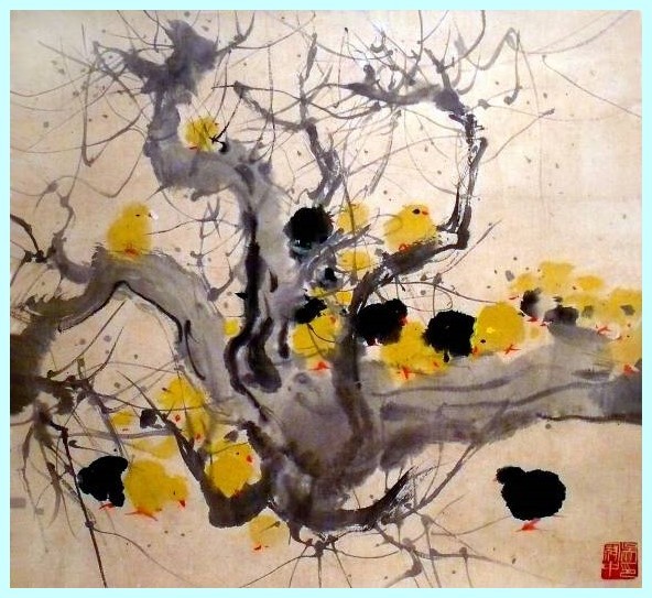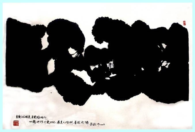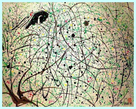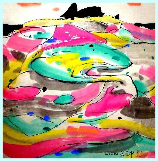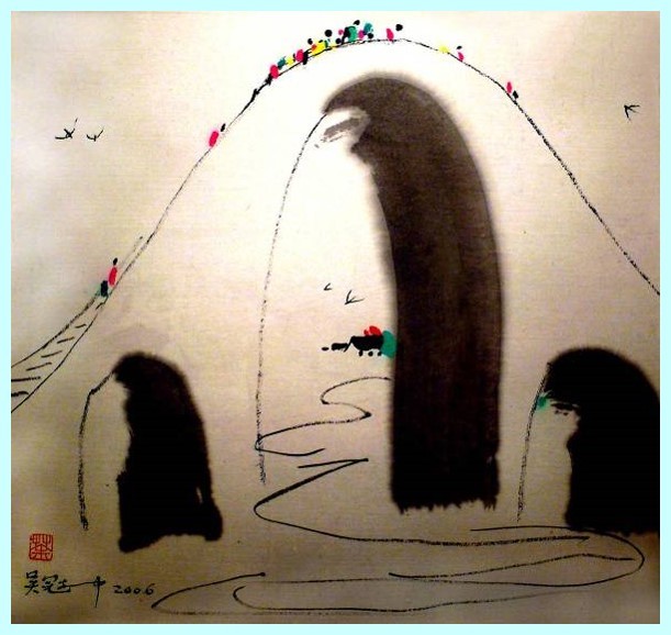 《渔港》作于80年代,源于浙江石塘,当时赶着风暴欲来的坏天气爬上山头,吴老先用素描作速写,返京后再凭记忆中的感受用墨彩完成。“动”与“密”是画面表现的目标,表现这目标依凭两个主要手法:船之黑块分布与浪之灰线缠绕。船上尖尖的桅杆之垂直细线彼此相呼应,也许仿效弹奏琴弦时之松紧。墨点似乎都属穿梭的小舢板,其轻重与散泼也许仿效了锣鼓的击打。船是写意的,泼墨挟色点,点泼于运动之中。细细描画船群,则要待风暴的宁静时刻。