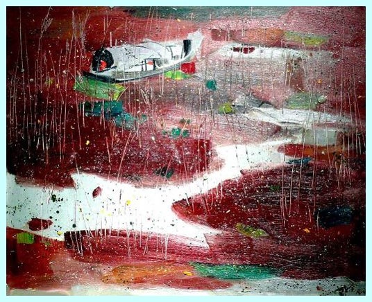 野水荒滩,铺满红藻浮萍,红得沉着,红得幽暗,像全无光泽的粗糙地毯。红色块面中伸出成群枯萎了的细瘦的苇枝,芦花已被风刮尽,于是突出了灰白色的线之林,并飘散着灰白色的片片与点点。我不喜欢红海洋,却钟情于这忧郁的红色荒野,这里一只被遗弃的舟,也是灰白的,细听暗红与灰白的对话,谅来系互诉衷肠,并非对唱恋歌。