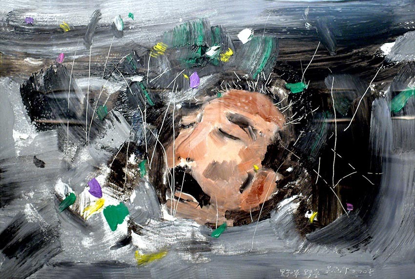 奔腾、跌宕,画图绕终生,坎坷犹未尽,彩点纷飞迟暮,白发人祈安宁。