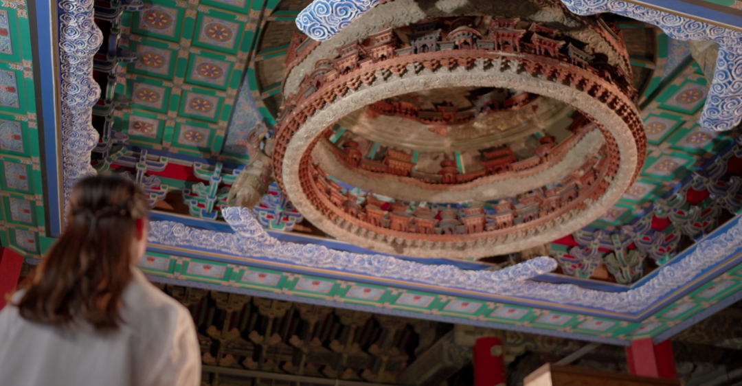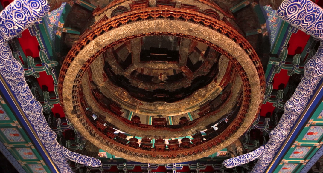 整个天宫藻井所有建筑均朝向圆心外侧,寓意世间万物均由宇宙奇点诞生,无限扩大,生生不息。