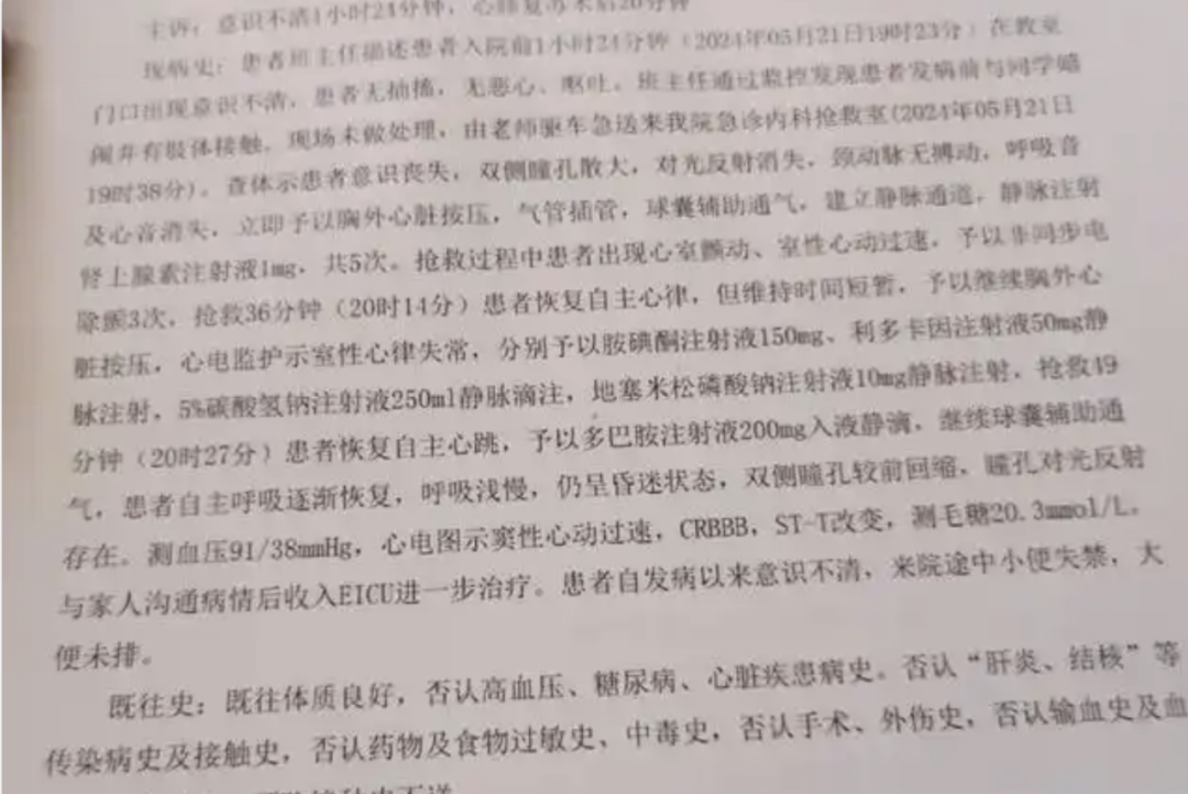 事发约4分钟后,有同学叫来了另一名老师,据同学回忆,这名老师掐了小杨的人中,小杨有了吸气反应。这名老师与其他同学将小杨抬到一位老师车内,小杨被送到了医院。事发约15分钟后,小杨被老师送至医院急诊内科抢救室治疗。