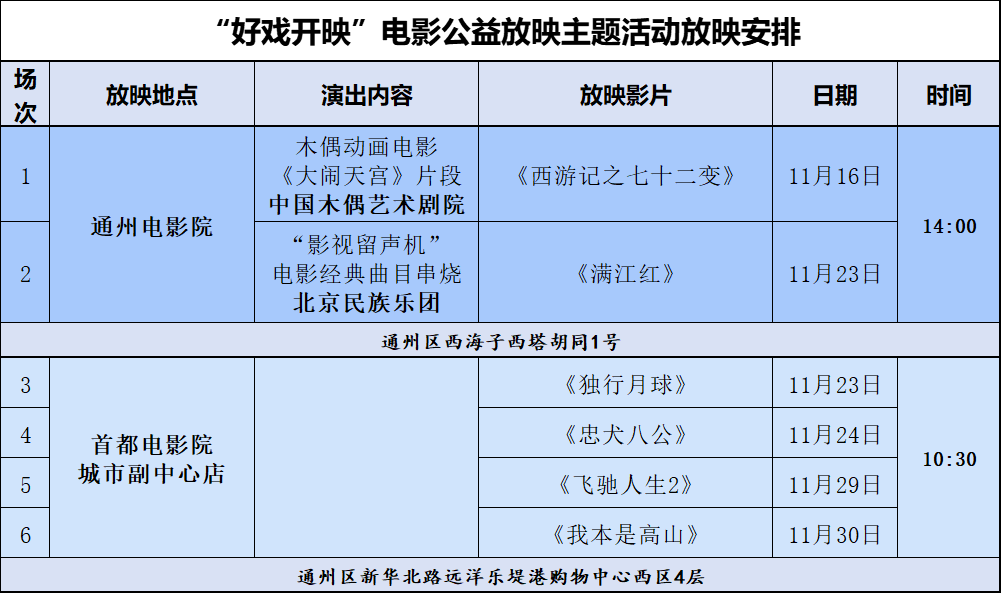“好戏开映”电影公益放映主题活动于11月16日开启,16日和23日两天将在通州区电影院进行两场别出心裁的放映活动,移植“京演1号厅”“电影+”模式,采用电影主题表演新形式,邀请北京演艺集团旗下中国木偶艺术剧院与北京民族乐团的艺术家到场献艺,在《西游记之七十二变》和《满江红》放映前分别为观众带来木偶剧动画电影《大闹天宫》经典桥段演绎与“影视留声机”经典电影音乐的民乐演奏。通过表演与放映的嫁接,让舞台与银幕有机融合,增添观影的沉浸感与仪式感,让观众对电影作品与舞台作品有更深的解读与感悟。