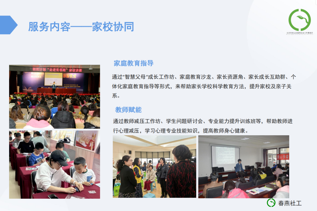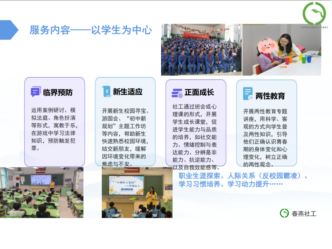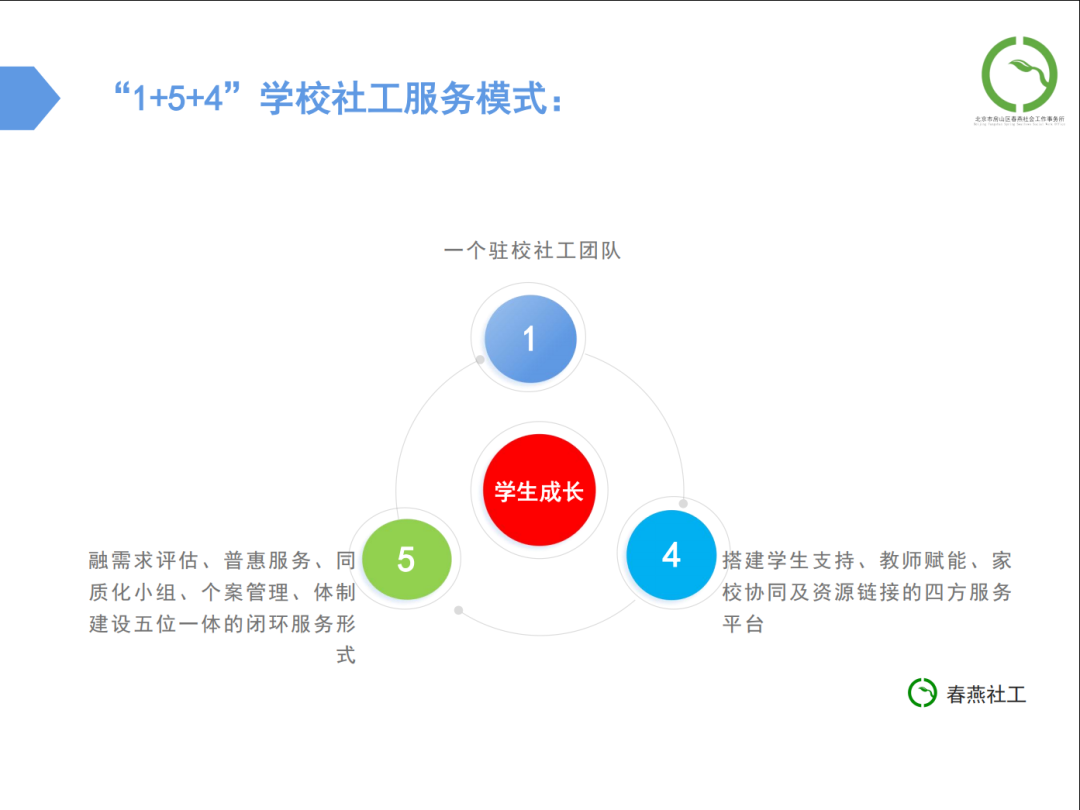 春燕社工事务所坚持以学生成长为核心,建立“1+5+4”学校社工服务模式,推动形成“社工+教师+家长+社区”协同机制。通过入驻1个学校社工团队,开展需求评估、普惠服务、同质化小组、个案管理、体制建设五位一体的闭环服务形式,形成学生支持、教师赋能、家校协同及资源链接的四方联动服务平台,全方位助力学生成长,促进家校社协同育人。社工机构在行宫园学校聚焦一年级学生的入学适应和六年级学生青春期心理健康教育两个主题,在良乡五中与学校将服务方向确定为临界预防服务,聚焦学生学习动力、情绪问题开展了初步服务,帮助存在心理困扰的学生走出阴霾。