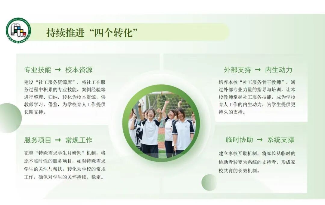 良乡五中学校坚持“原色育人,生态发展,让教育因适合而美好”的区域理念,系统构建“良星星”育人体系,与社工专业团队联动,针对部分学生学习动力不足的情况,建立个性化支持机制。以初二年级中存在厌学倾向的学生为对象,组建专项小组,为其量身定制成长计划,借助情景模拟、任务闯关等形式,引导学生重拾学习信心。同时,学校联合社工开展法制教育、生涯规划及青春期心理健康等主题讲座,构建“教联体”协同育人体系。通过“学校主导、专业支撑、家庭参与、社会协同”的多方协同、共促成长模式,推动学生健康教育实现“四个转化”,即:将专业技能转化为校本资源,建设”社工服务资源库”;将服务项目转化为常规工作,完善“特殊需求学生月研判”机制;将外部支持转化为内生动力,培养本校社工骨干教师;启动家长支持学院,使家长成为育人体系的有力支撑。通过“四个转化”,引导学生明事理、知边界、懂敬畏、养品性,最终助力学生将良好的文化与规矩内化,实现“山花烂漫,各得其所”的成长样态。