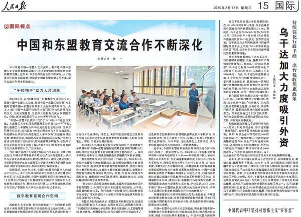 2月12日,人民日报在第15版刊文《中国和东盟教育交流合作不断深化》,文中说:涡轮的左右手定则、程序仿真验证;在河南新乡职业技术学院牧野工匠学院开设的海外线上培训授课上,该校智能制造学院国际教学团队的老师正用英语讲授机电一体化技术专业课程。课堂上,来自印度尼西亚三宝垄教育大学的450余名学生认真地听着老师的讲解,不时低头做笔记。课后,印尼学生踊跃提问。2023年12月,新乡职业技术学院与印尼三宝垄教育大学共同举办“中国—东盟智能制造牧野工匠学院”揭牌仪式,国际课程开发是牧野工匠学院建设的主要内容之一。项目采取联合培养方式,侧重智能制造及新能源汽车教学主题。