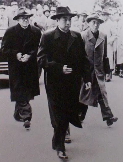 飞机停稳了,第一个走出机舱的就是周恩来。他身穿得体的大衣,右手自然地举过眉梢,微笑着向前来迎接的人们致意。