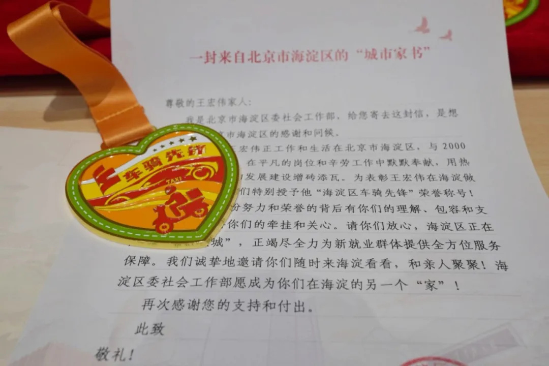 她因伟大的母爱和自强不息的精神获评2025年“北京榜样”和“感动海淀”年度人物。海淀区委社会工作部在活动中向新就业群体优秀代表颁发了“车骑先锋”徽章,并送出了《一封来自北京市海淀区的“城市家书”》,表达对奋斗者的敬意和支持。