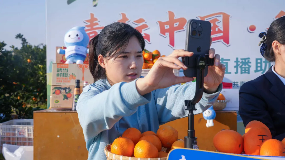 今年12月,掌握新技能的骆静怡第一次踏上丹江口的土地。她被眼前的美景震撼——清澈的丹江口水库波光粼粼,远处武当山轮廓隐约可见。在凉水河镇的柑桔园,她架起手机,开始了户外直播。
