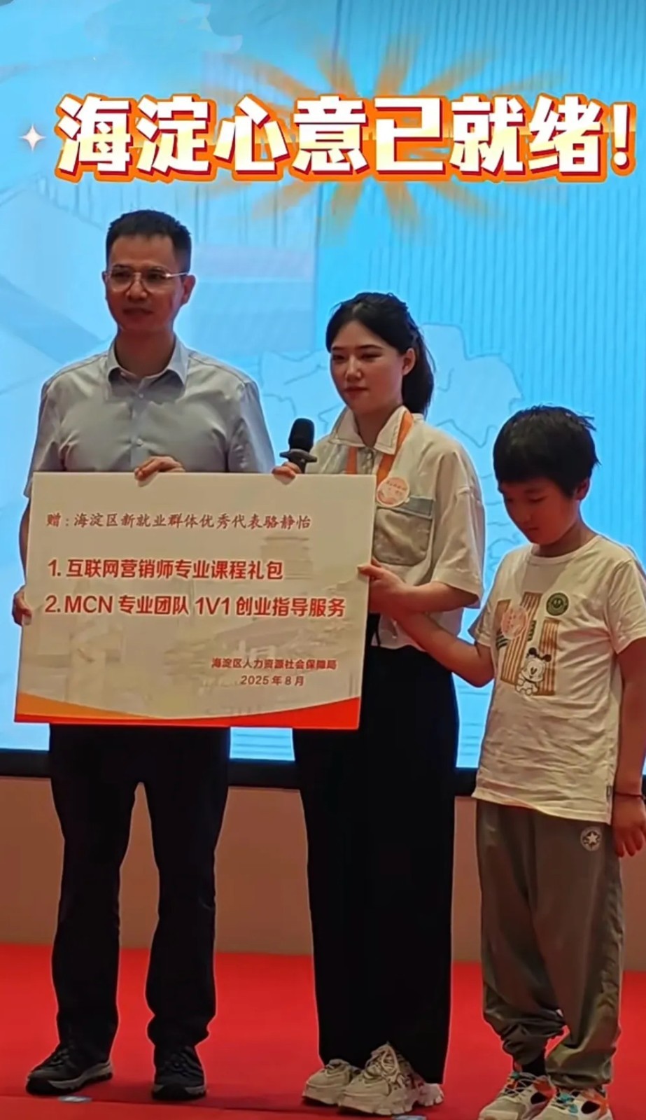 骆静怡的自强精神引起了社会各界的关注。今年8月,在海淀区“海淀暖新·十一伴行”活动启动仪式上,她分享了自己带儿子来京求医,从摆地摊、送外卖到转型做自媒体的经历。