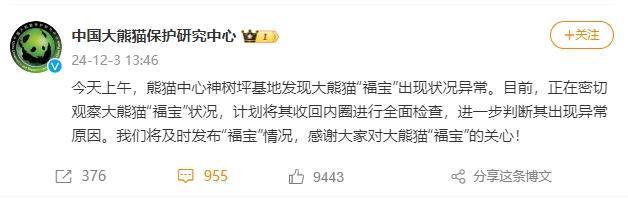 据大熊猫保护研究中心消息,今天(12月3日)上午,熊猫中心神树坪基地发现大熊猫“福宝”出现状况异常。目前,正在密切观察大熊猫“福宝”状况,计划将其收回内圈进行全面检查,进一步判断其出现异常原因。