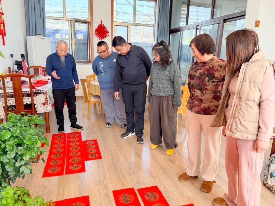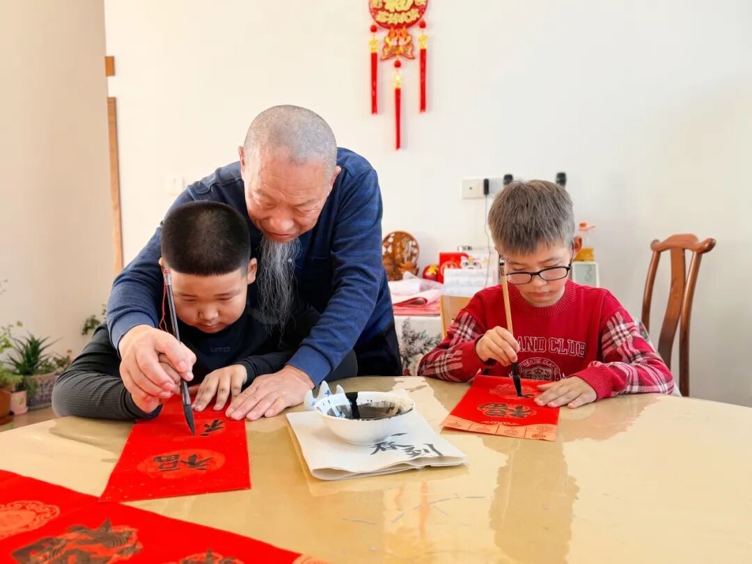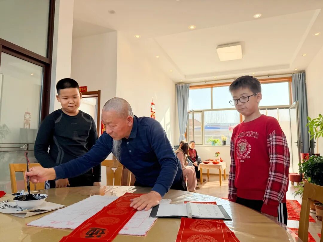 来解长生家的人中还有两个孩子的身影。孩子目不转睛地盯着解长生的笔尖,看着墨汁在红纸上晕染出工整的字迹,也跃跃欲试。“握笔要稳,手腕放松……”解长生手把手地教孩子们握笔、运笔。孩子们的笔触虽稚嫩,却写得格外认真,整个屋子充满了新春的热闹与温情。“今天和解爷爷一起写福字感觉特别有意义。”村民崔子书说。