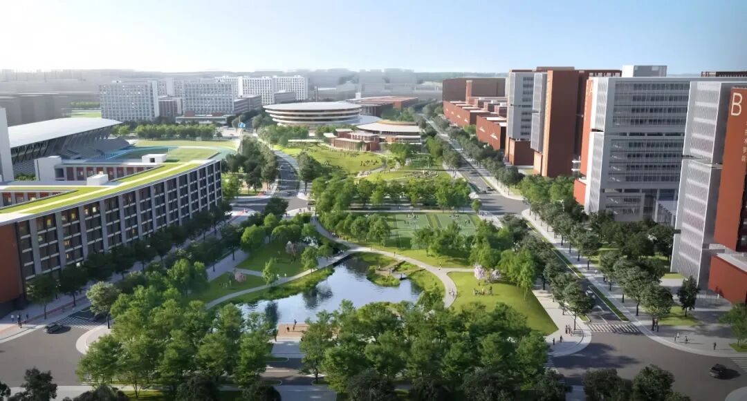 一期项目以“十字联城,轴带共长,化直为曲,合理布局”为设计理念,从“联城、绿脊、构园、延脉、弹性、匠韵、碳汇”七个维度思考生态为基、人文为本、创新为魂的未来校园新模式, 致力于实现“城市窗口”与“生态绿肺”双效合一,打造国际化学术高地,构筑友好式活力校园,树立智慧化生态典范。