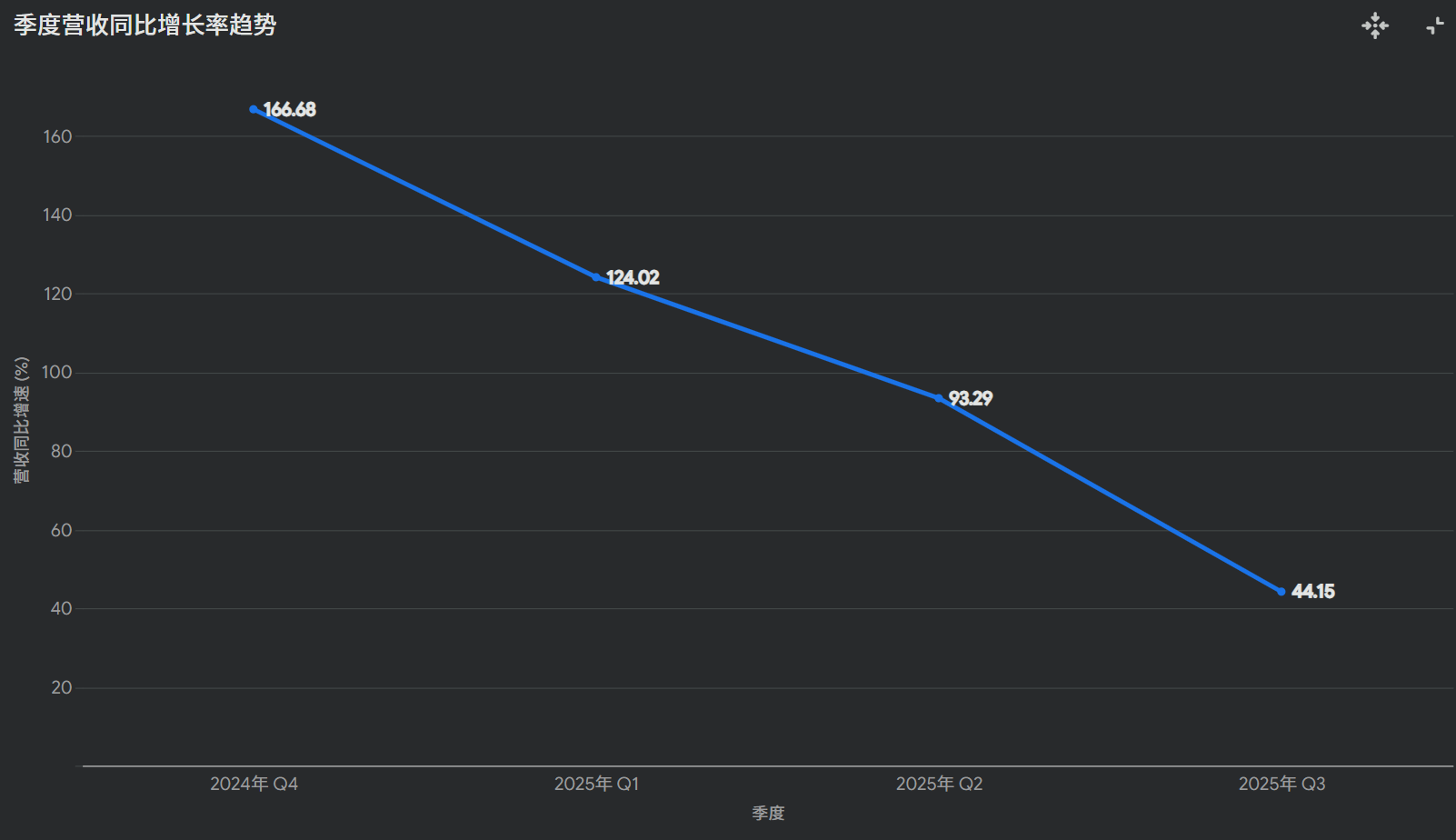 最后,净利润增速亦大幅回落。虽然2025年第三季度归母净利润同比增长361.22%仍处高位,但相比2025年第一季度3344.13%和第二季度4940.33%的增幅,增速已明显放缓。