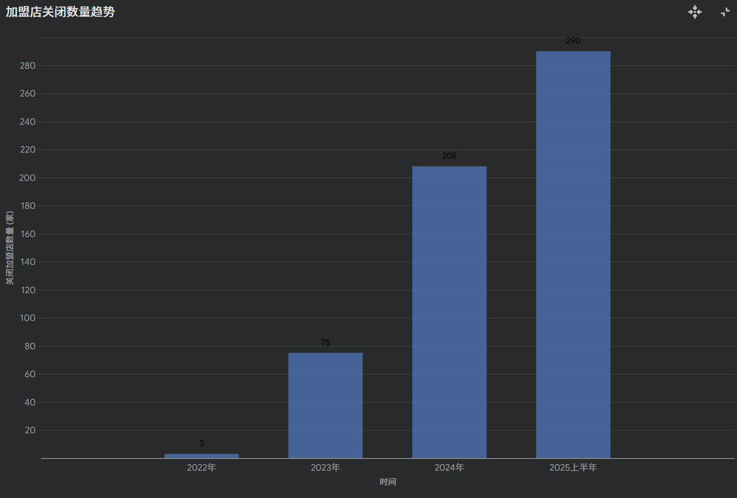 代价二:闭店加速,扩张放缓。加盟网络底层生态已经亮起预警信号。2025年上半年万辰集团关闭加盟店290家,这一数字已超过公司2022–2024年三年关闭加盟店数量的总和(分别为3家、75家、208家,合计286家)。