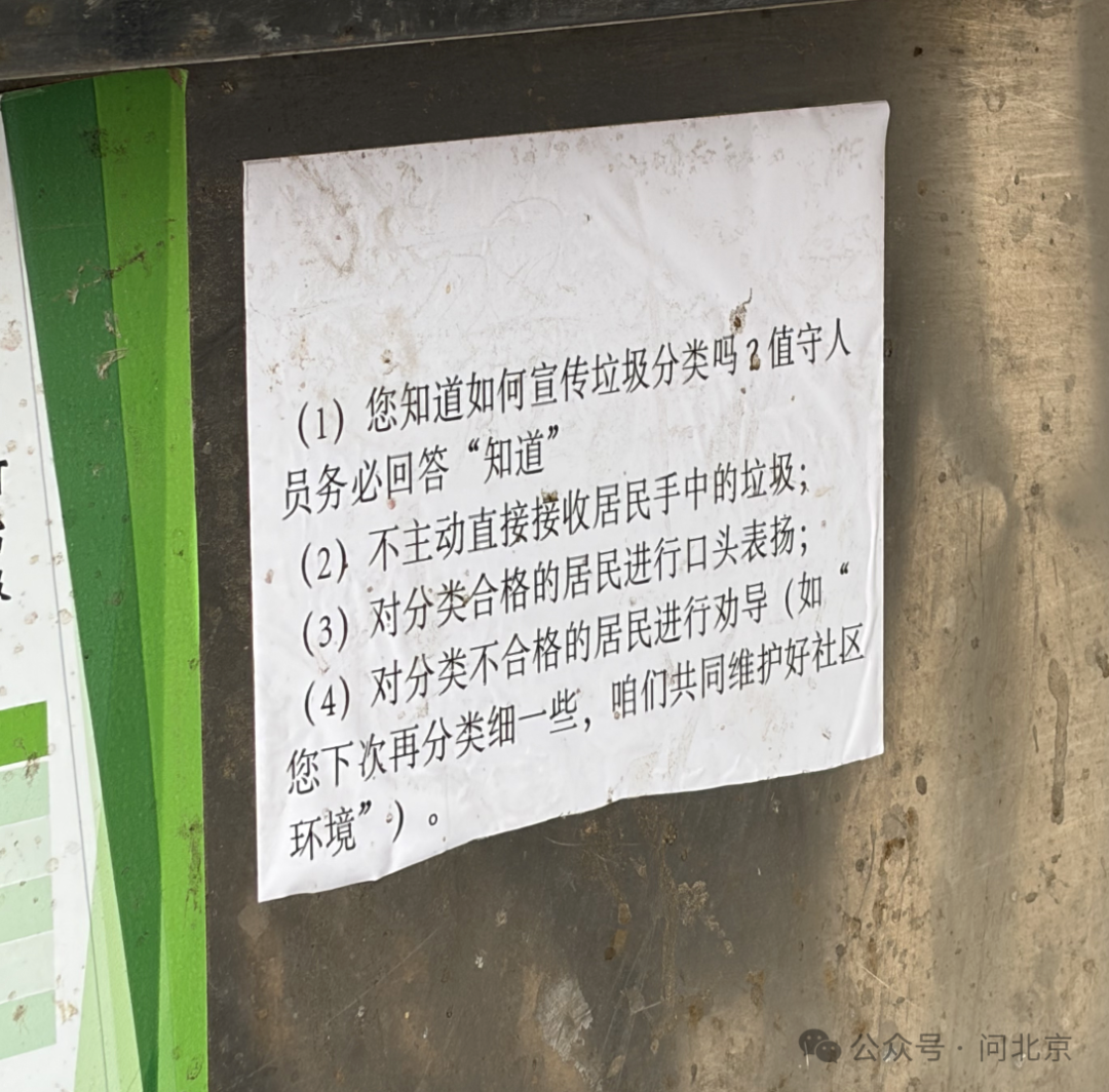 “问北京”记者在各个小区探访时看到,每个垃圾桶站点都贴有桶前值守人员如何帮助居民进行垃圾分类的提示和小区垃圾桶投放点巡查记录表,桶前值守人员需要记录巡查时间、垃圾是否混投、周边是否整洁等内容。一位正在分拣垃圾的工作人员告诉记者,他每天需要对站点投放的垃圾进行简单分类,“撤桶并站”后,桶前值守人员减半,每个站点的垃圾桶数量增多,现在一个人要干原来两个人的活。