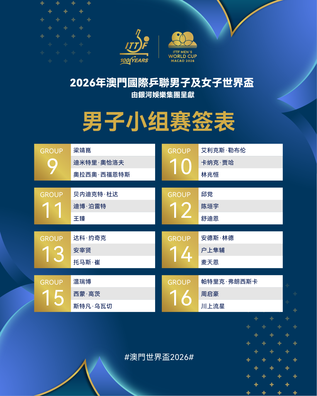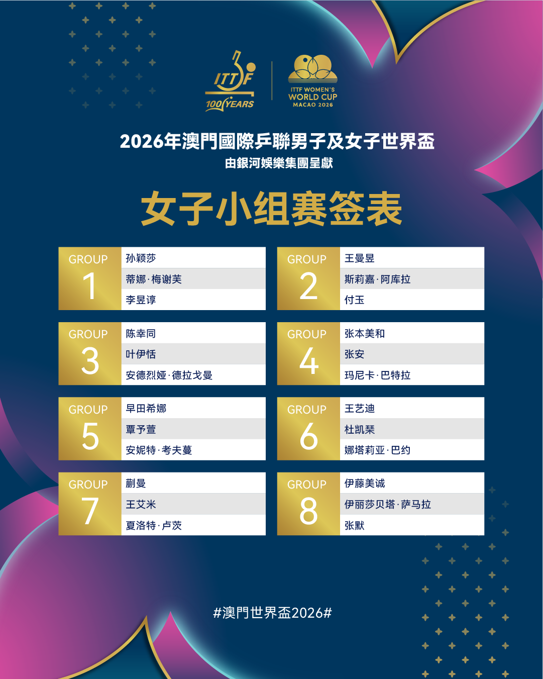 2026年澳门国际乒联男子及女子世界杯将于3月30日至4月5日在中国澳门银河综艺馆举行。届时,来自五大洲的男、女各48位顶尖运动员们将展开激烈角逐,本次赛事小组赛签表已出炉。
