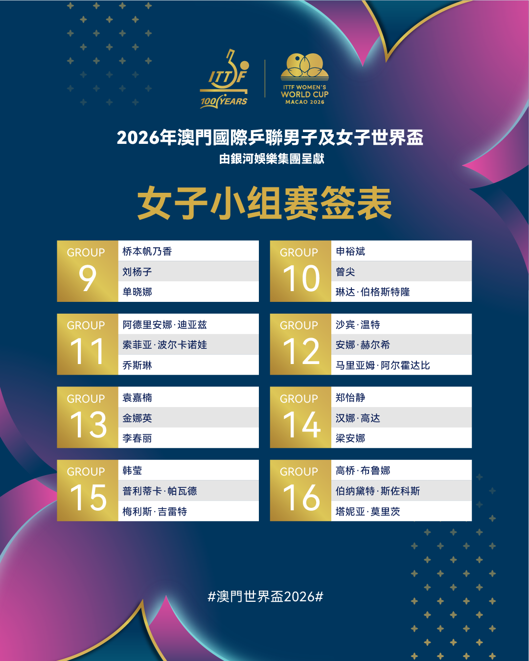 2026年澳门国际乒联男子及女子世界杯将于3月30日至4月5日在中国澳门银河综艺馆举行。
