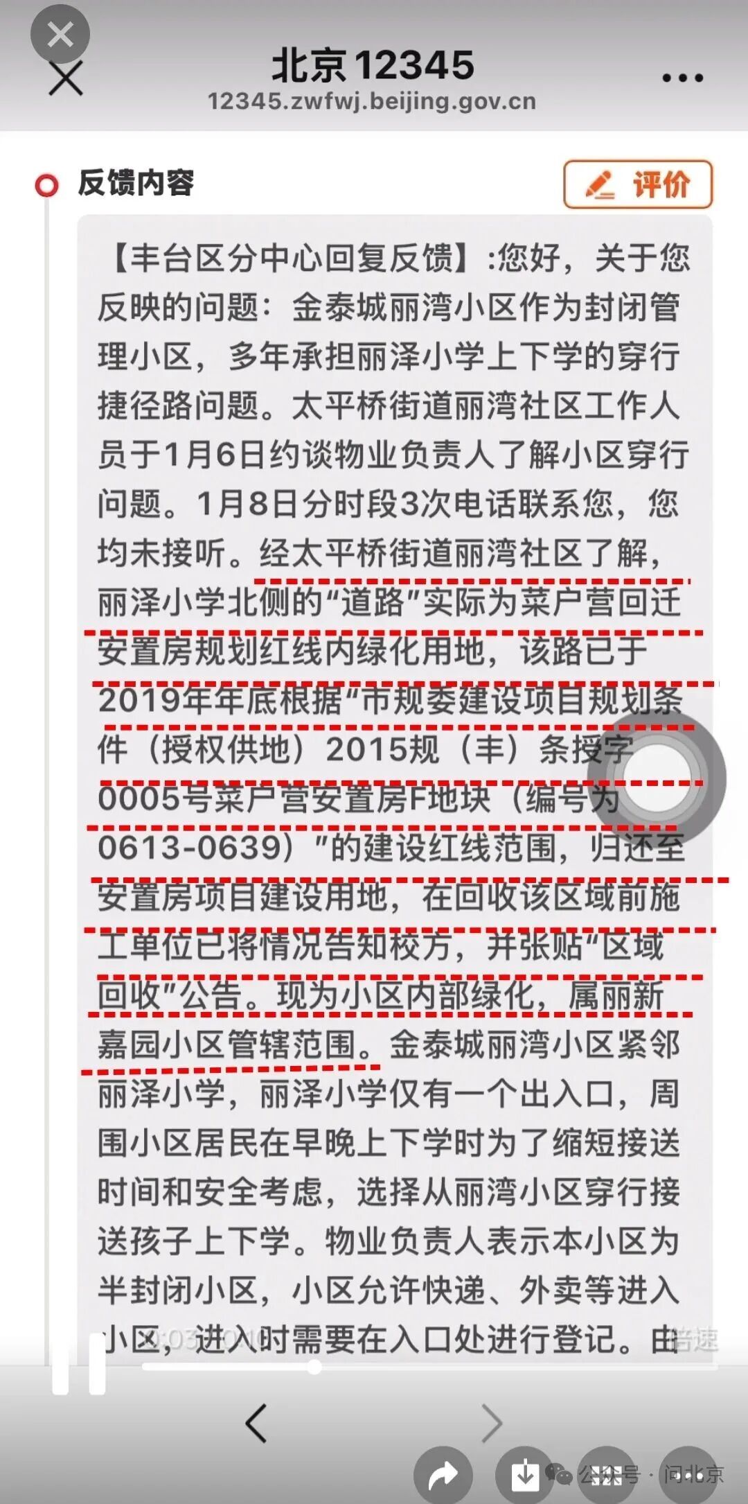 原本便捷的上学路,为何会被小区占用?属地太平桥街道丽湾社区回复称:丽泽小学北侧的 “道路” 实际为菜户营回迁安置房规划红线内的绿化用地,已于 2019 年年底根据 “市规委建设项目规划条件(授权供地)2015规(丰)条授字0005号菜户营安置房F地块(编号为0613-0639)” 的建设红线范围,归还至安置房项目建设用地,在回收该区域前施工单位已将情况告知校方,并张贴“区域回收”公告。现为小区内部绿化,属丽新嘉园小区管辖范围。