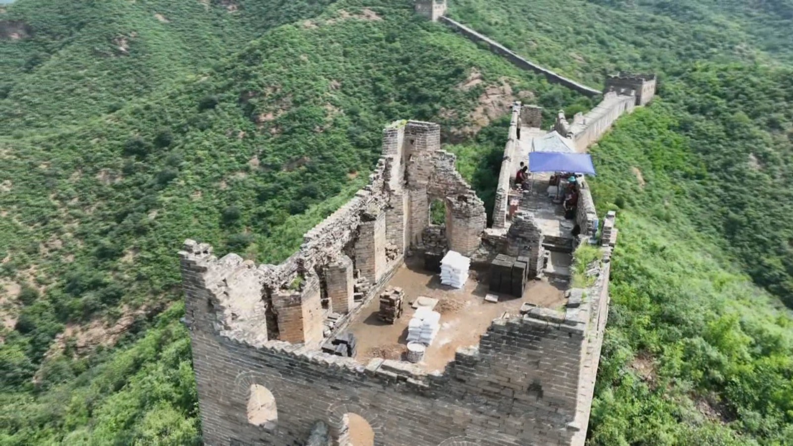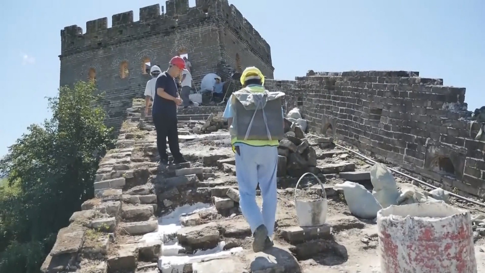 工作人员告诉记者,他们在金山岭长城修缮工作中,本着"最小干预、修旧如旧"的原则,将能用的老砖留下,替补风化面砖,同时还增加排水系统,减少雨水对墙体的侵蚀。