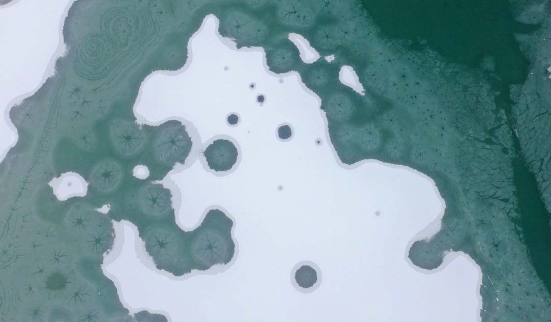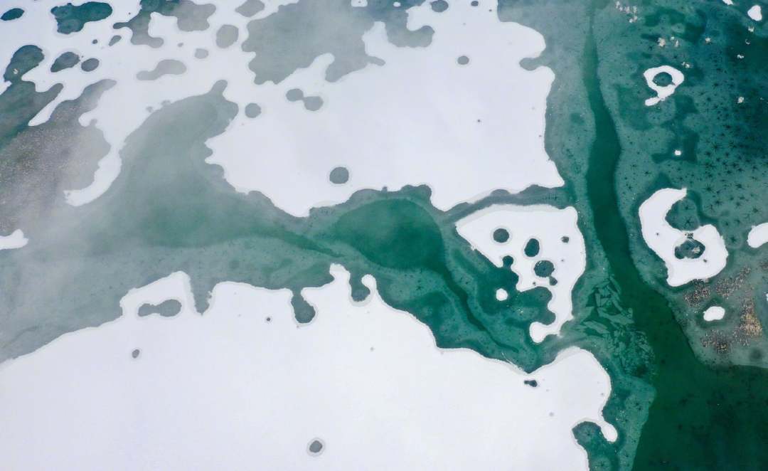 2021年11月28日,位于新疆巴音郭楞蒙古自治州尉犁县的罗布湖,雪与冰面形成了独特的造型。