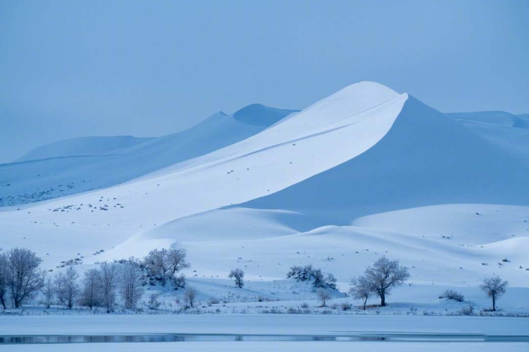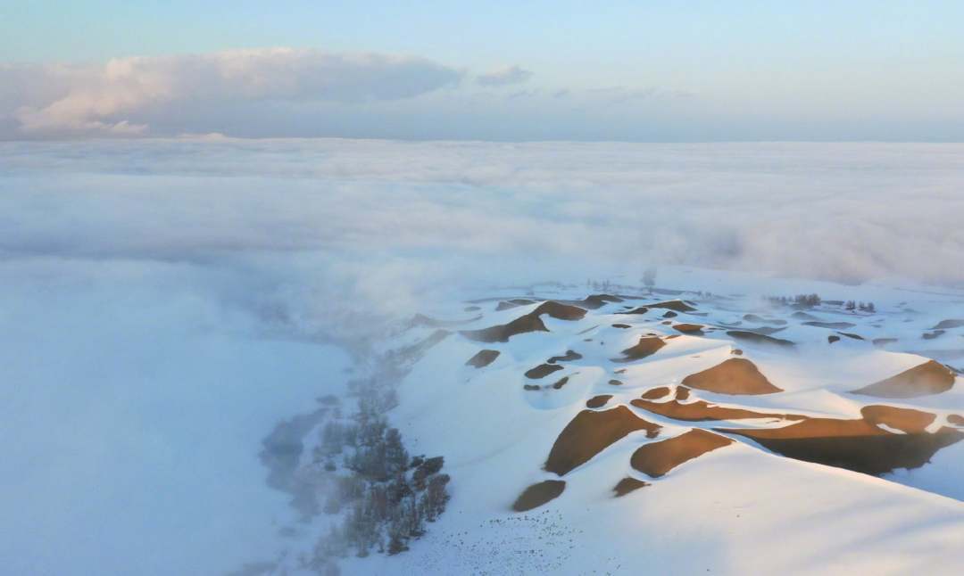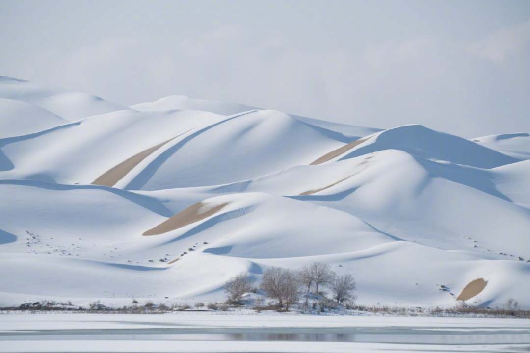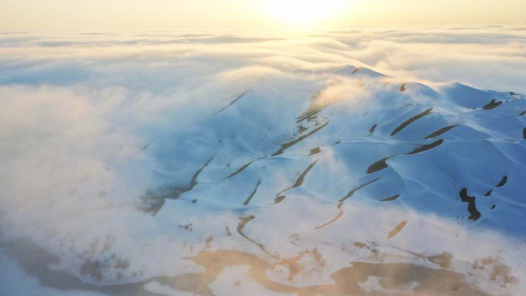 近日,新疆塔克拉玛干大沙漠迎来降雪天气。雪后,连绵不绝的沙丘像披上了银装,云雾在上空缠绕,沙漠、胡杨、湖泊时隐时现,宛若童话世界。紧邻沙漠的罗布湖也出现“半脂半湖”绝美景观。塔克拉玛干沙漠降雪相对较为罕见,因此吸引了不少摄影爱好者前往采风。一起来看新疆雪后白沙漠!