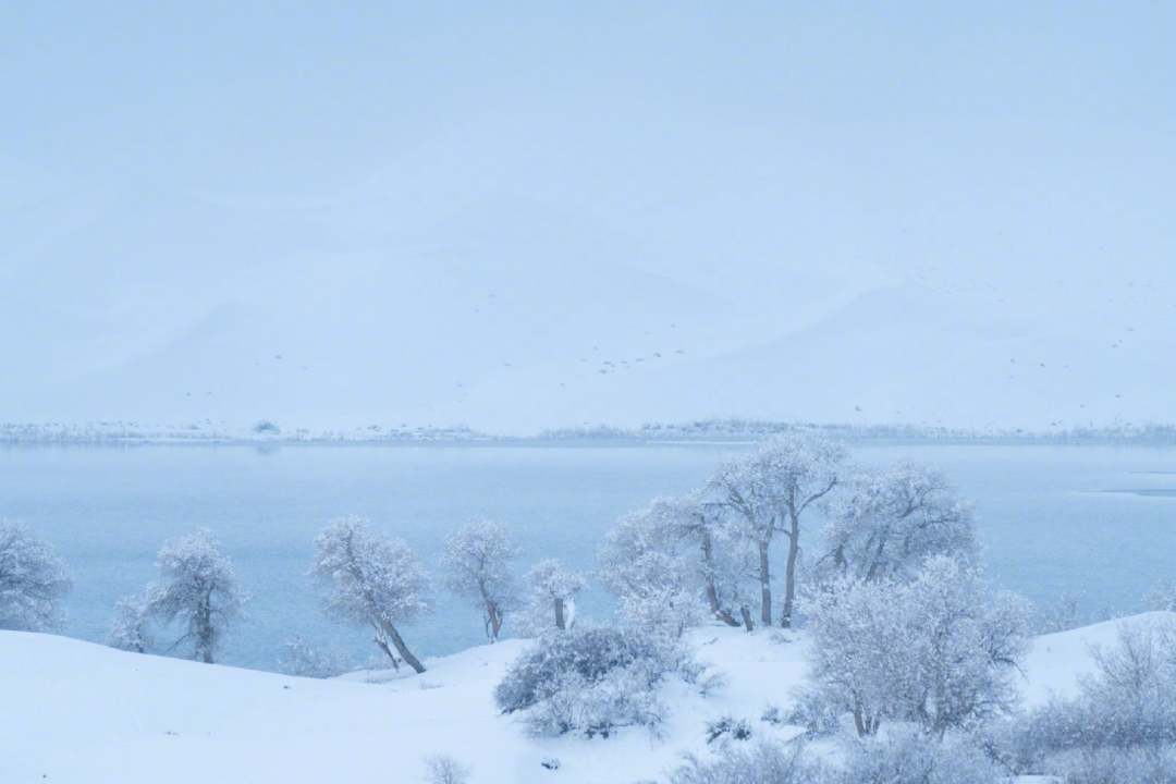 2021年11月28日,位于新疆巴音郭楞蒙古自治州尉犁县的罗布湖,披上了银装的沙漠、胡杨及湖泊形成一幅美丽的画卷。