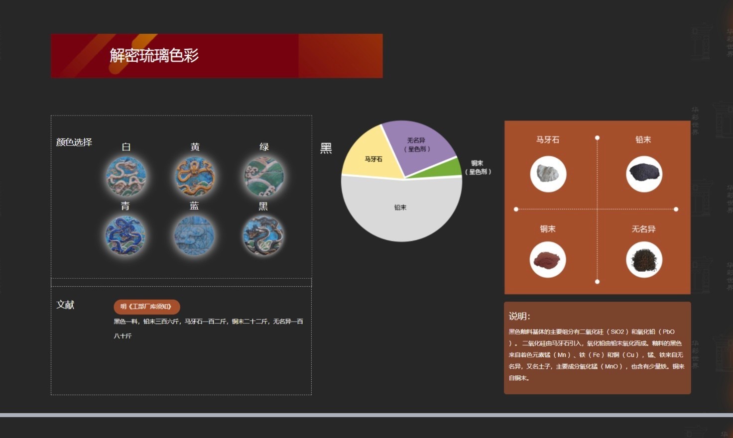 作为中国古代宫城发展史上现存的惟一实例和最高典范,也是世界上现存规模最大、保存最完整的古代宫殿建筑群,故宫既是世界文化遗产地,也是藏品规模最大的博物馆,建筑所包含的多种类型材料将绚烂的中国色彩传递到世界各地。琉璃是故宫华彩世界的组成元素,是古人营造观念的集中体现。