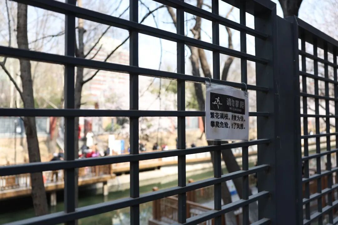 赏花点的围栏多为木质或铁质,高度约1.5米。攀爬行为不仅容易导致围栏松动、倾斜,也使攀爬者面临坠落受伤的风险。