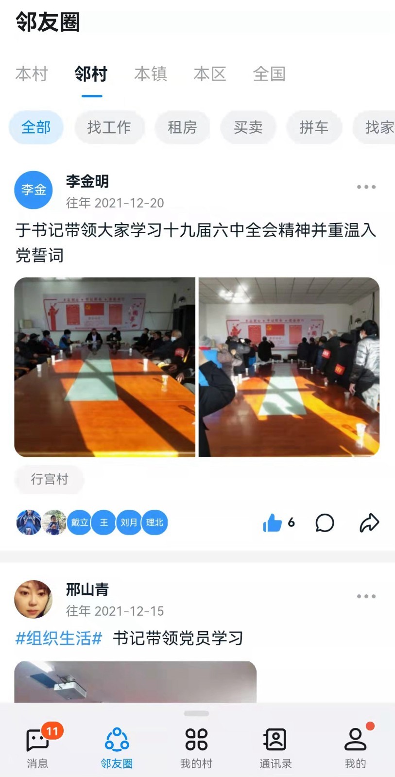 在基层组织数字化工作的基础上,“百姓通”还同步开展了三务公开、邻友圈、疫情防控等基层治理场景的数字化应用建设。村干部通过“邻友圈”发布三务公开、村庄建设、好人好事等信息,村民有啥事儿也可以直接发到“邻友圈”,比如反馈路灯修理、环境整治、拼车进城等,同时村委还可以开展“最美庭院”、“关爱老人”等各种特色活动。“百姓通”拉近了乡村干群关系,形成“共建、共治、共护”的美丽乡村家园,丰富了村民“精神、物质”的双文明生活。