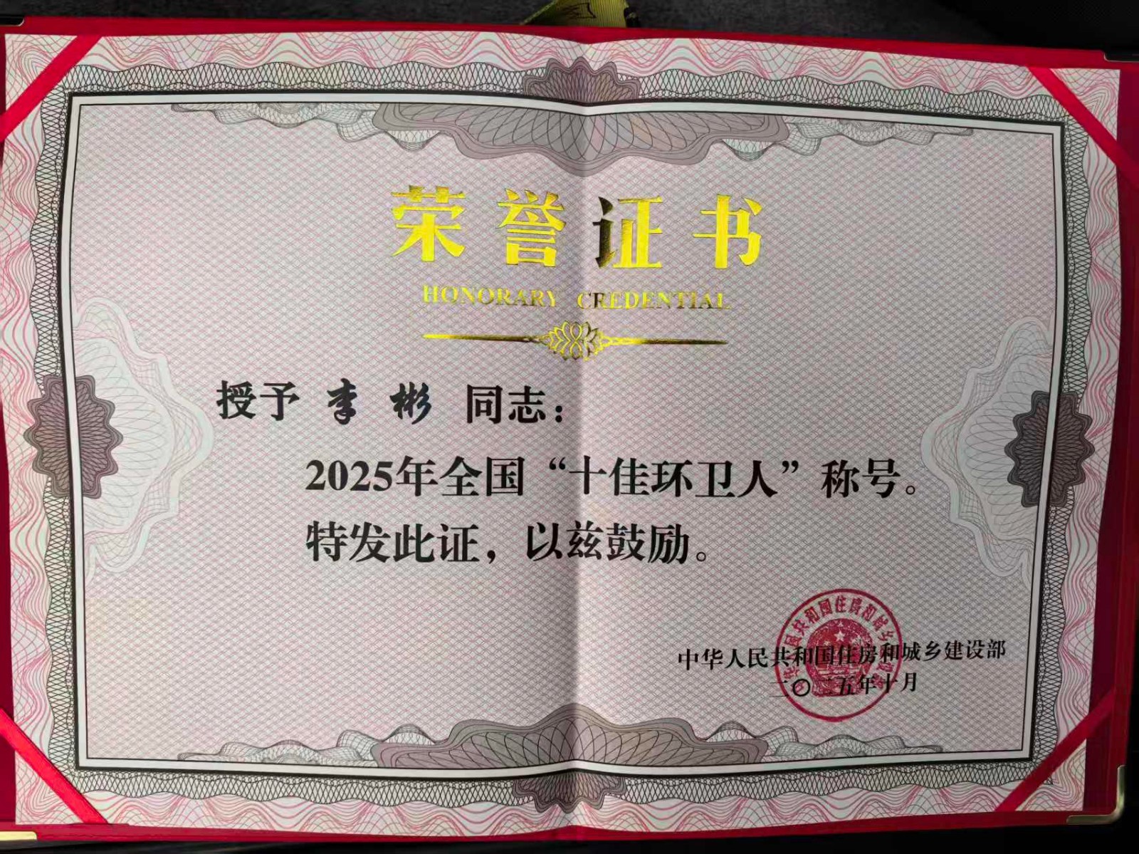 近日,住房和城乡建设部公布2025年全国“十佳环卫人”名单,北京环卫集团李彬荣列其中,获评全国“十佳环卫人”。