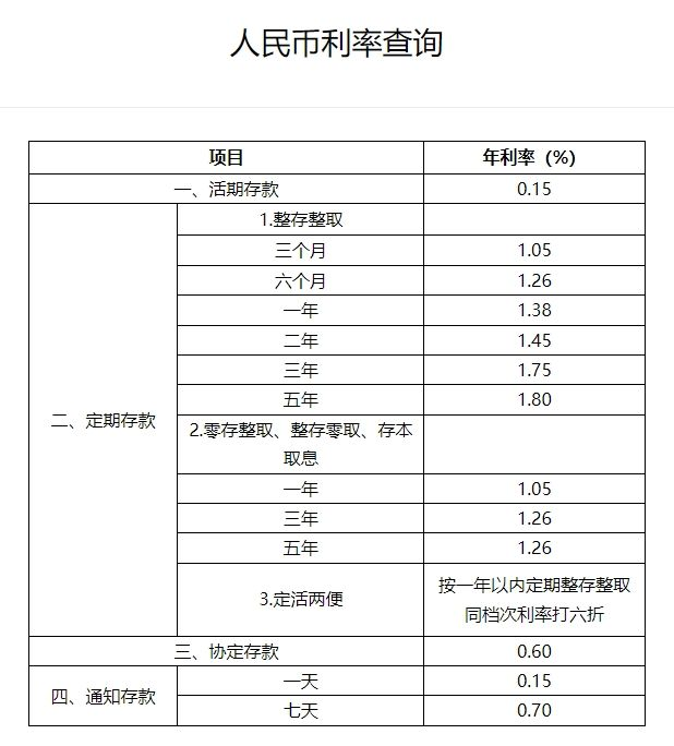中国邮政储蓄银行具体调整如下:活期存款年利率为0.15%;定期存款方面,三个月为1.05%,六个月为1.26%,一年为1.38%,二年为1.45%,三年为1.75%,五年为1.80%;零存整取、整存零取、存本取息一年为1.05%,三年和五年均为1.26%;定活两便按一年以内定期整存整取同档次利率打六折;协定存款为0.60%;通知存款一天为0.15%,七天为0.70%。