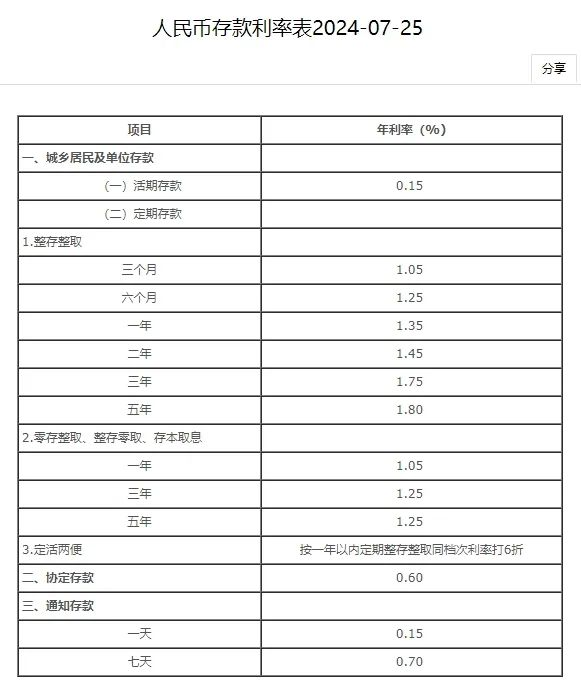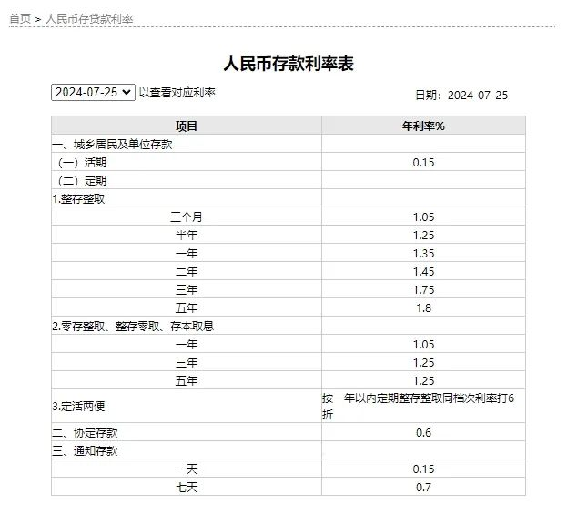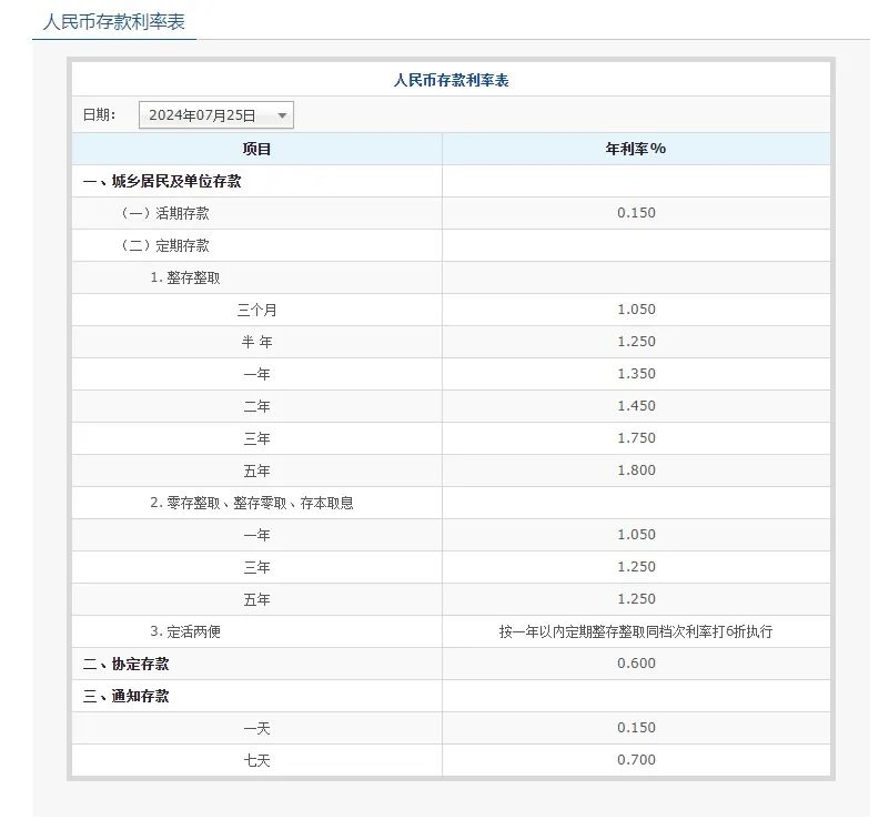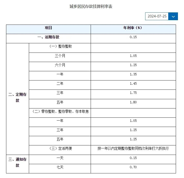 交通银行官网显示,交行于7月25日下调了人民币存款利率,其中活期存款下降5个基点,定期整存整取三个月、半年期、一年期利率均下调10个基点,分别为1.05%、1.25%、1.35%;二年期、三年期、五年期利率分别下调20个基点,至1.45%、1.75%、1.80%。零存整取、整存零取、存本取息利率下调10个基点,通知存款挂牌利率下调10个基点。