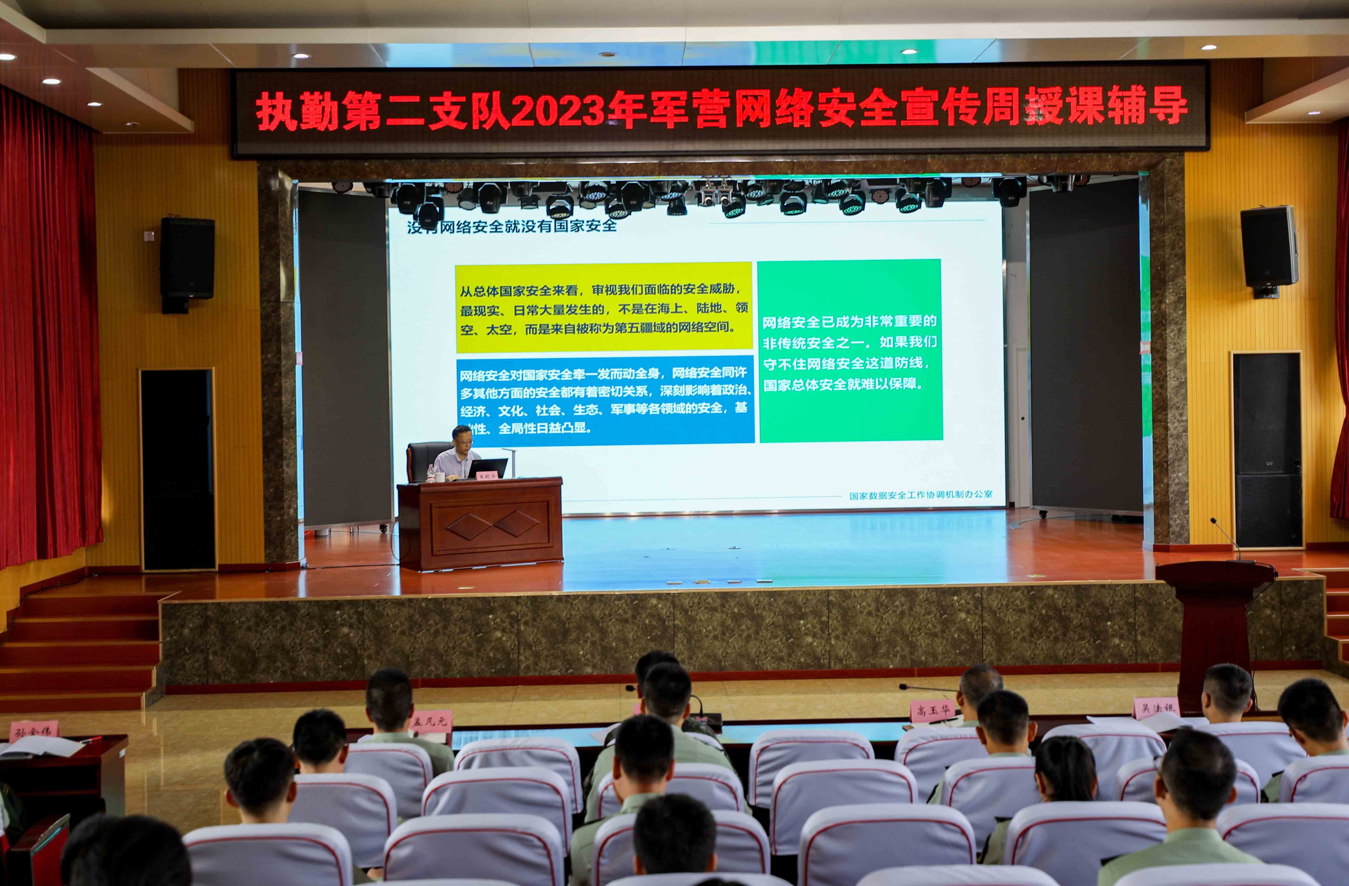 结合国家网络安全宣传周进军营活动,该支队邀请到了中央国家安全委员会办公室信息技术中心王明华主任教授围绕《没有网络安全就没有国家安全》为主题的授课辅导,让支队全体官兵进一步了解了当前网络安全形势,提高了网络安全防范意识。过不了网络关,就过不了时代关。维护军营网络安全,我们人人都是“守门员”让不法分子无门可入。该部某中队指导员徐晨曦在课后讨论课堂上告诉大家。