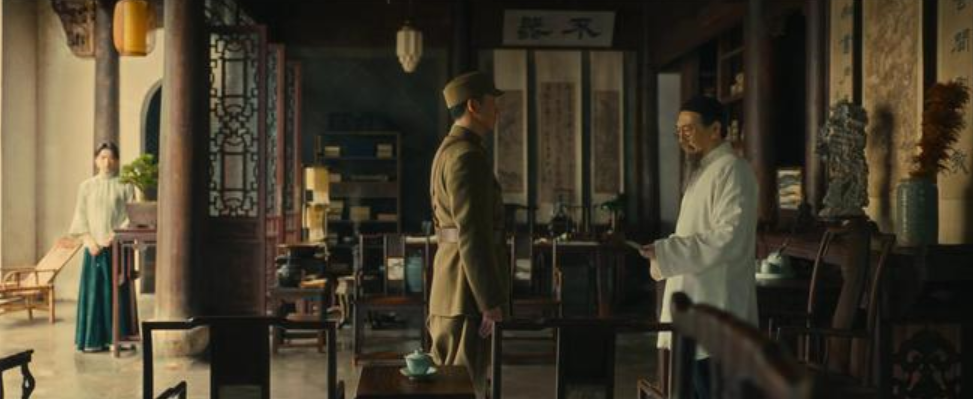 比如送儿上战场的戏份,他表面上平静地谈书论画……待儿子转身离去时,握着毛笔的手却不禁颤抖起来,墨汁滴落在宣纸上,“晕染”出满是不舍和牵挂的慈父心。