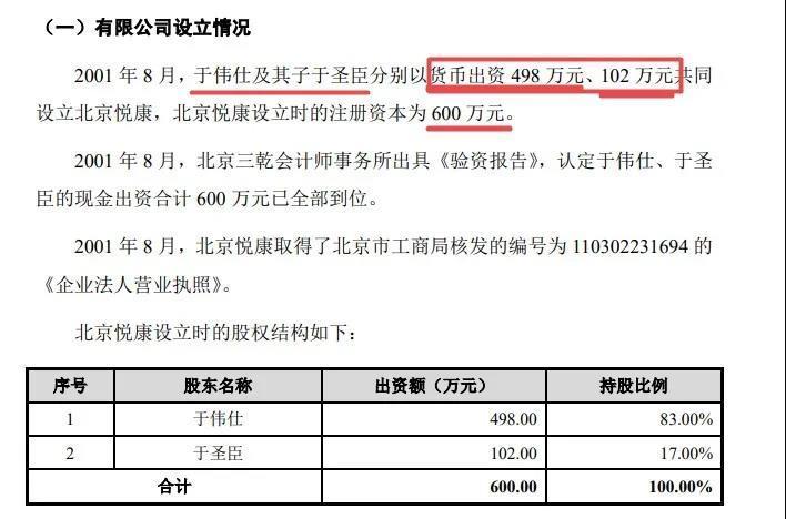 招股书披露,2001年8月,于伟仕及其长子于圣臣分别以货币出资498万元、102万元共同设立悦康药业前身北京悦康,设立时的注册资本为600万元。然而,招股书并没有披露于世伟父子货币出资资金来源及其合法性。