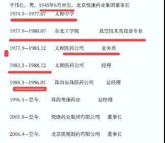 据人民网消息,于伟仕早年毕业于安徽阜阳市太和县太和中学,在东北工学院真空技术与设备专业读书三年,后担任太和医药公司业务员、经理,1988年1月开始担任珠海东珠医药公司总经理,后任珠海粤康药业总经理。于伟仕曾因经营头孢类产品被业界熟知,被称为“头孢大王”。当然,这份简要经历也存在疑问,如读书时间和业务员时间重合等。