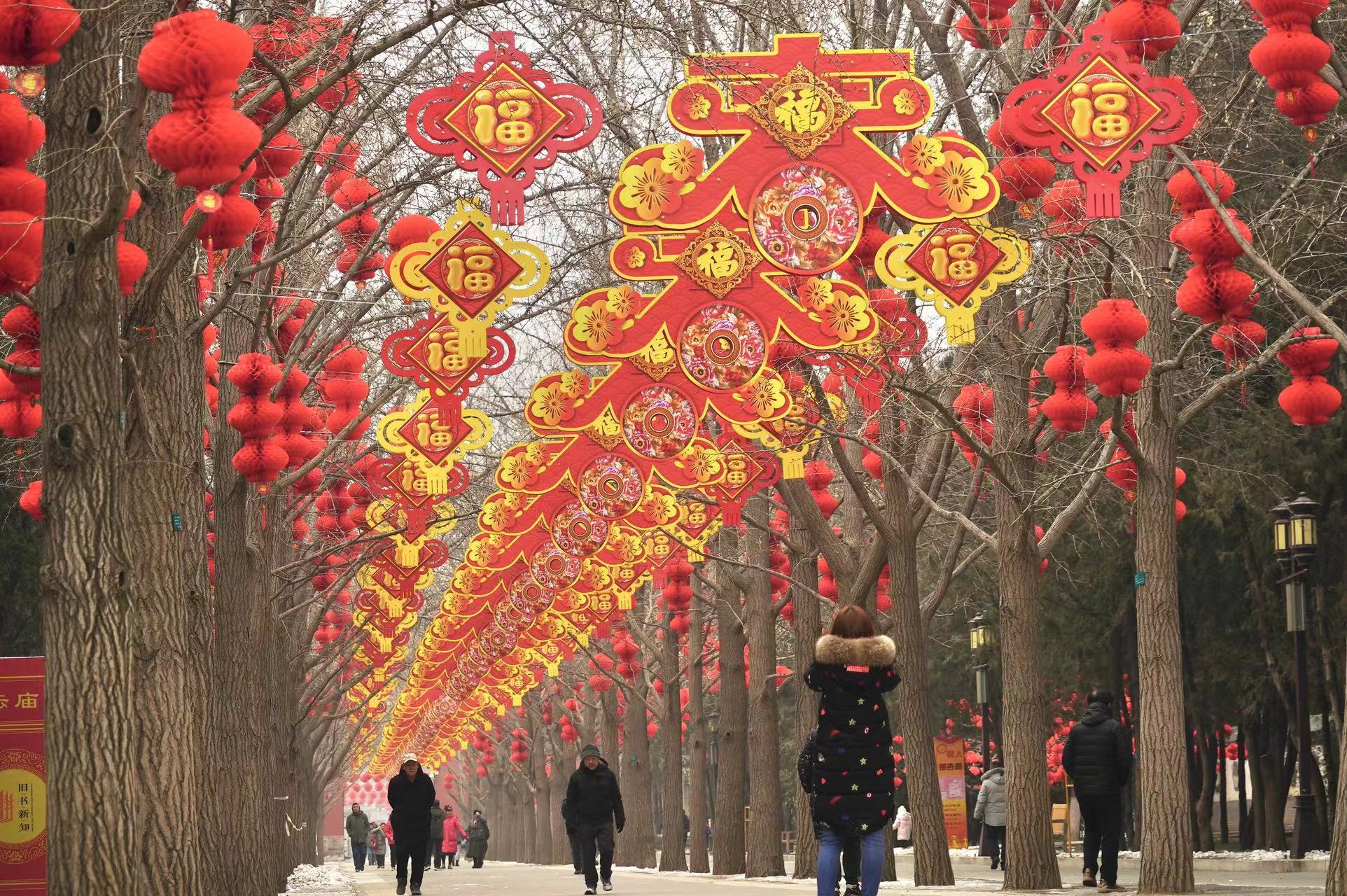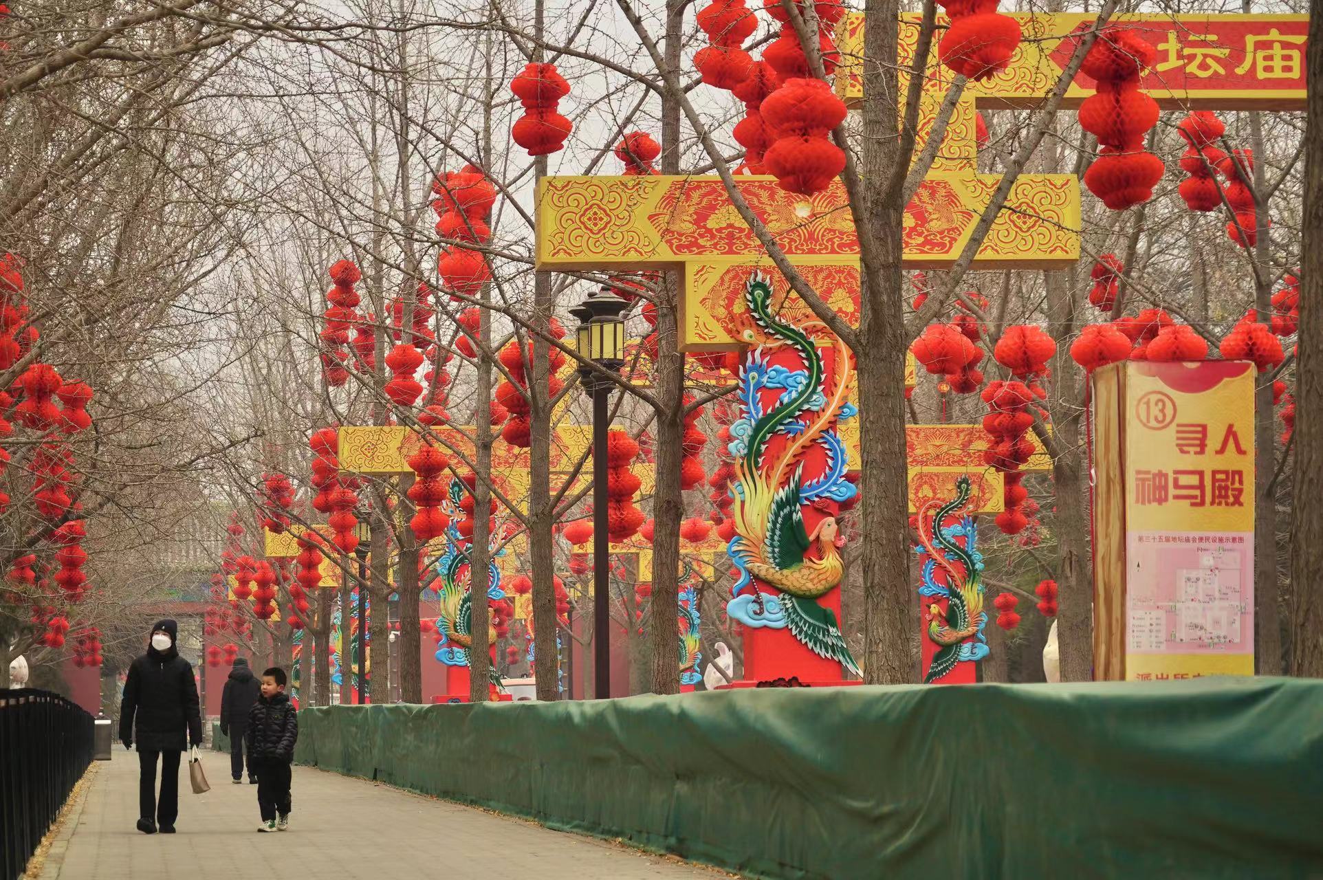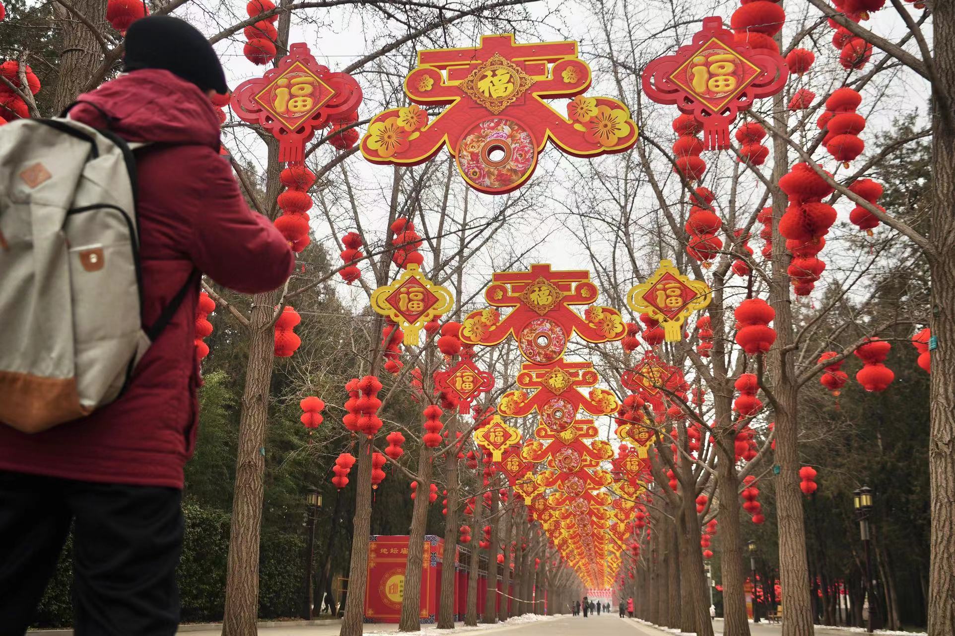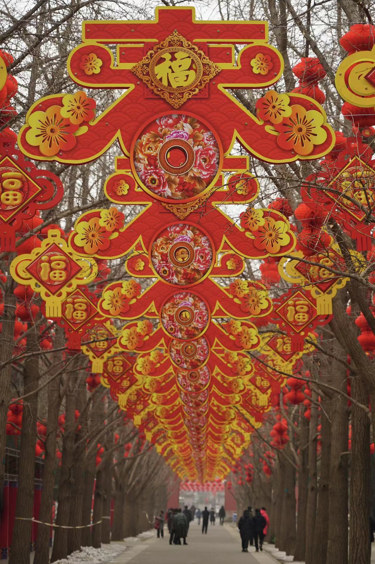 1月31日,地坛公园西门以代表中国年节色彩的红、黄色为基调的景观已基本布置完成,大银杏路也以变身“春之大道”,以“春”字与象征吉祥如意的中国结、红灯笼相搭配,烘托喜庆节日氛围。