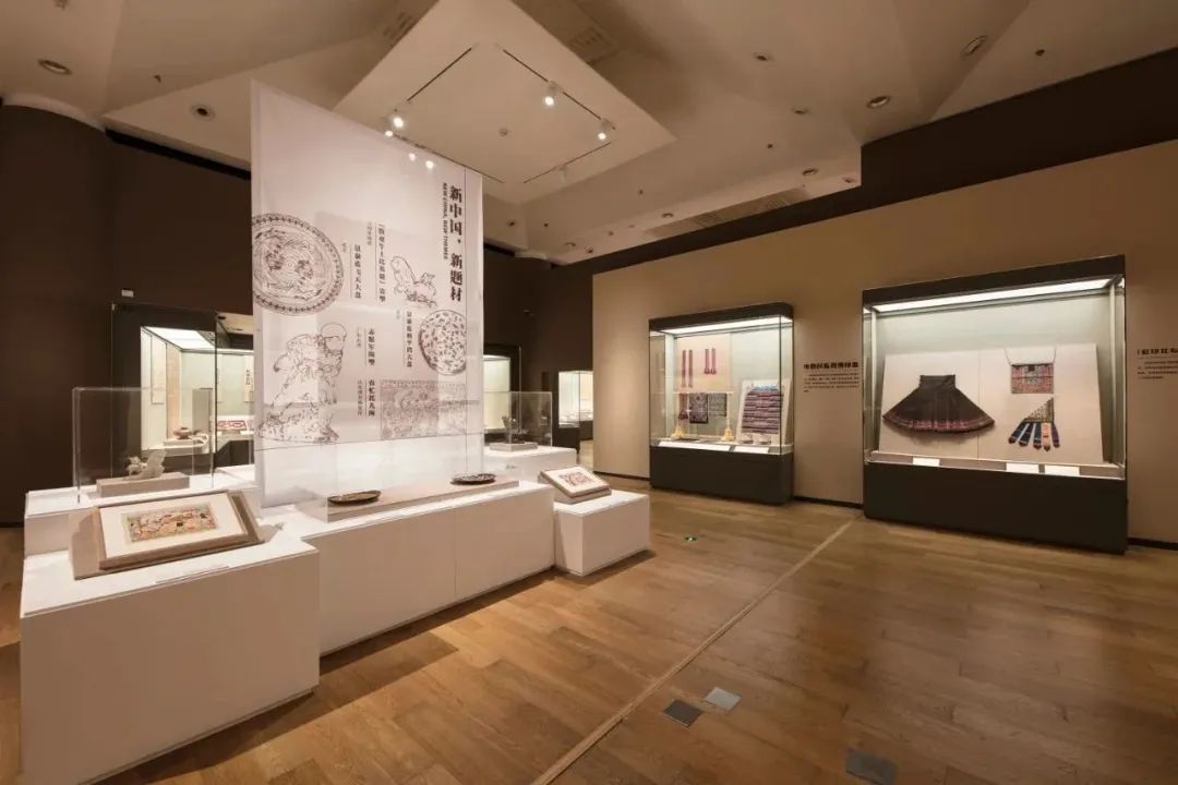 1953年的展览包括陶瓷、染织、刺绣、金属工艺、漆器、编织品、雕塑品及木偶、年画、剪纸、玩具等工艺品类,规模宏大,品类丰富,展品精美,影响广泛。本单元主要通过展览纪念章、纪念章设计图、展览说明书、明信片、展览相关出版物和研究图示、时间轴、展品门类框架图、产区工艺门类图,梳理其脉络与影响。