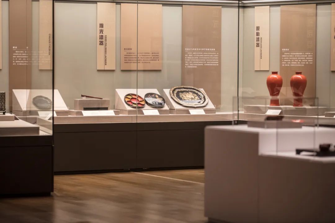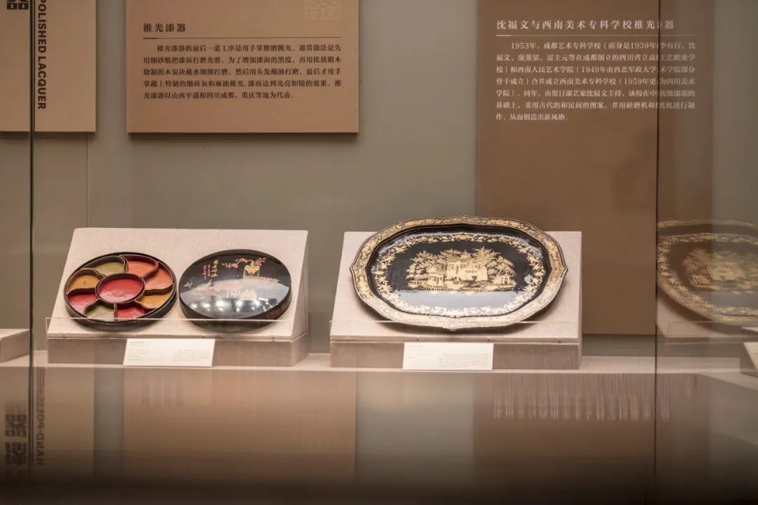 本单元漆器主要来自福建、北京、江苏、四川、山西等地。福建的脱胎,北京、江苏的雕漆,四川、山西的推光漆各有特色。展品以日用品为主,亦有少数欣赏陈设品。福建福州脱胎漆器轻巧灵便,色泽美观。北京以雕漆见长,造型古朴,装饰典雅。江苏扬州漆器以螺钿见长,具有文人风趣。福建永春描金彩绘漆篮富有装饰性。玲珑剔透,多用于宗族祭祀活动。山西平遥和四川成都推光漆器,工序繁琐,装饰精美,彩绘富丽。四川凉山彝族漆器多髹红黄黑三色漆,质朴粗犷,具有民族特色。