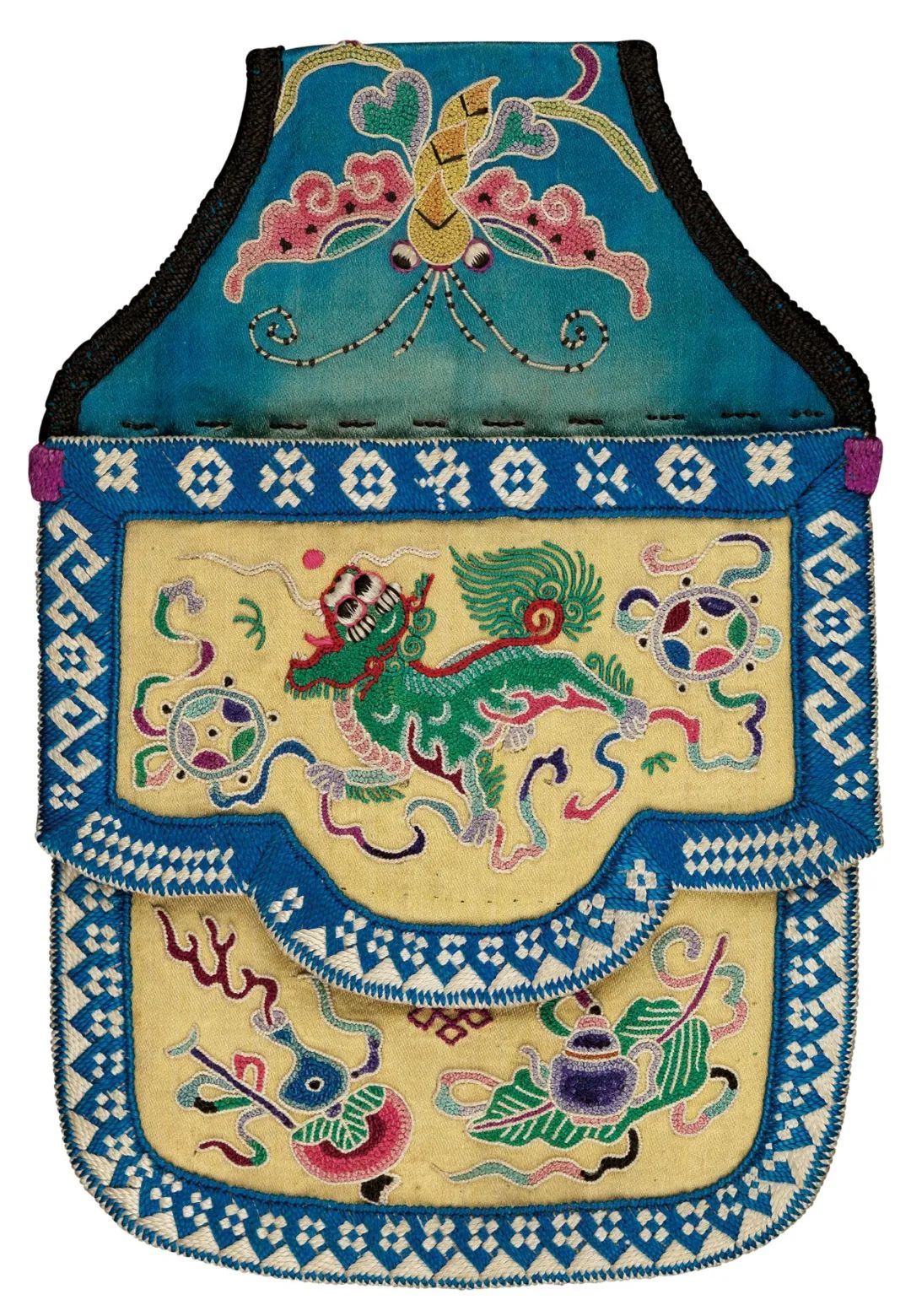 黄缎地打子绣狮子滚绣球纹荷包