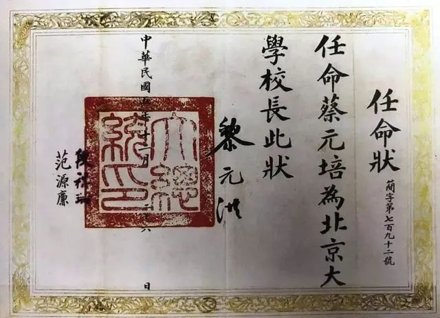 ▲民国大总统黎元洪签署的任命蔡元培为北京大学校长的任命状