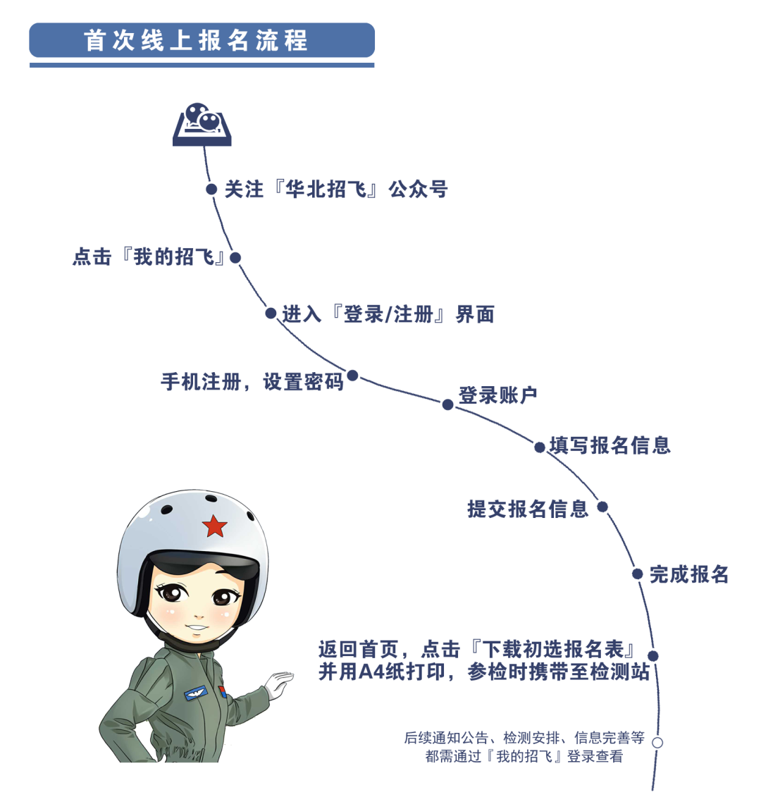 选拔流程各环节中所列举的检测时间均为通常情况,准确信息以教育部门通知、华北招飞微信公众号公布内容为准,请及时关注。