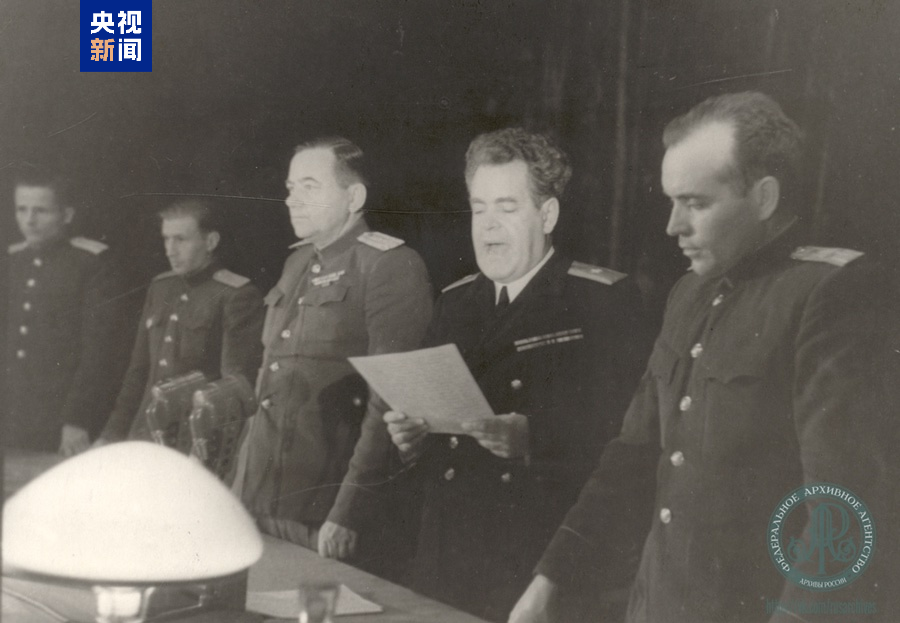 △1949年12月,苏联军事法庭庭长、司法少将切尔特科夫宣读判决书。