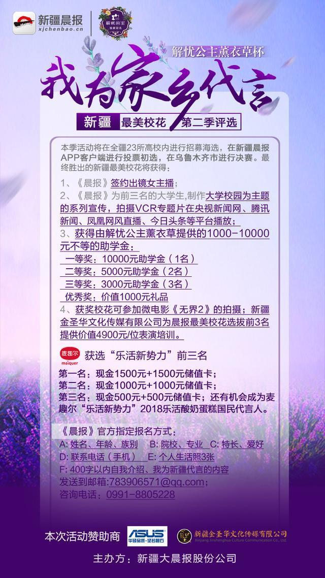解忧公主薰衣草杯“我为家乡代言——新疆最美校花”第二季评选活动火热报名中,只要你够范!够颜!够胆!你就是最美校花!我们为你提供足够大的平台来展示自己!在这里,你可以获得《晨报》女主播实习的机会;你可以获得企业助学的万元奖金;你可以获得麦趣尔“乐活新势力”活力女孩千元奖金、金圣华选角助星计划微电影《无界2》的女演员……我们期待更多的校花学霸来加入我们,QQ: 783906571(照片+姓名+院校+联系电话),show出你的光彩,点亮我们的舞台!