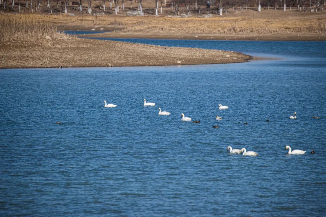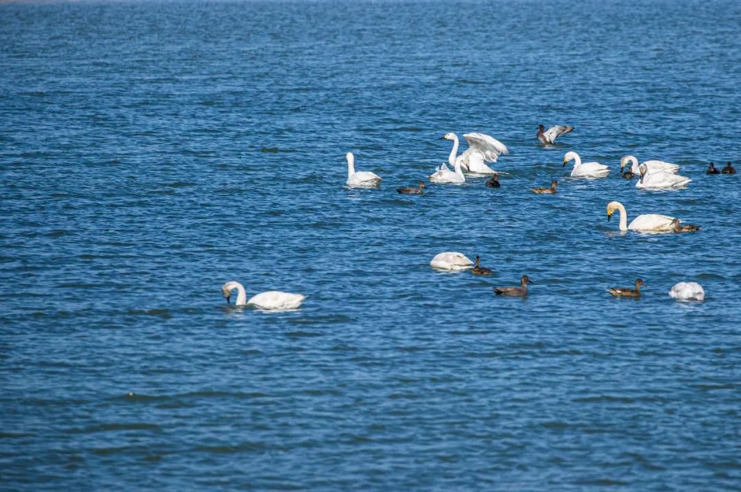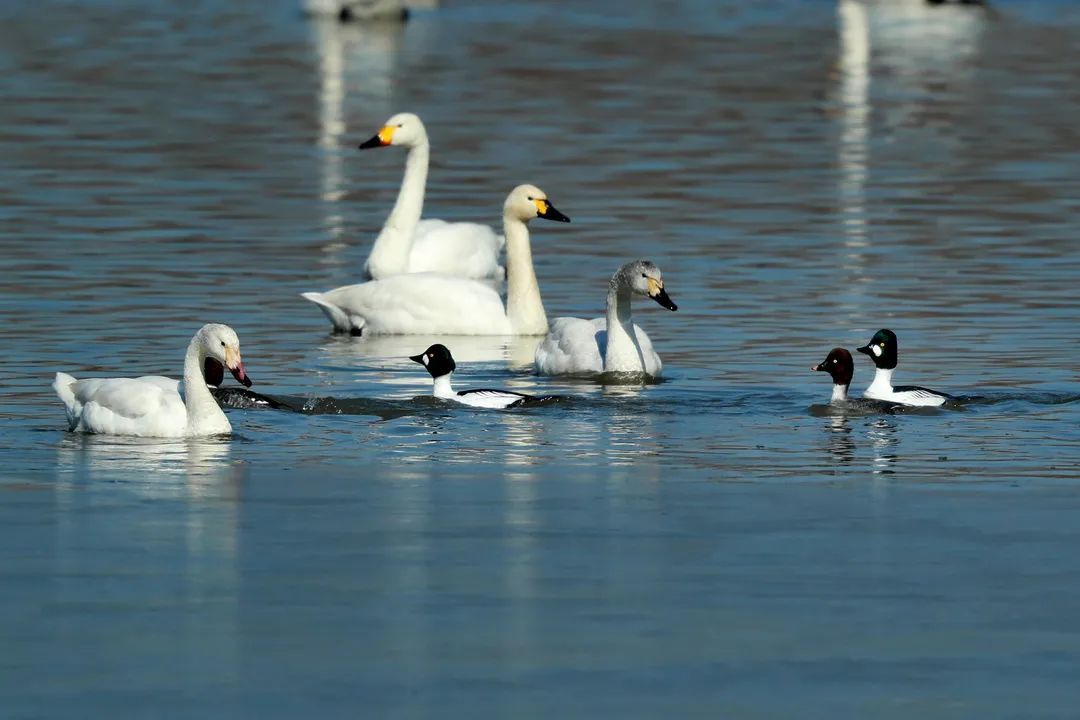 △白天鹅与鹊鸭正悠闲自在地泛游湖面