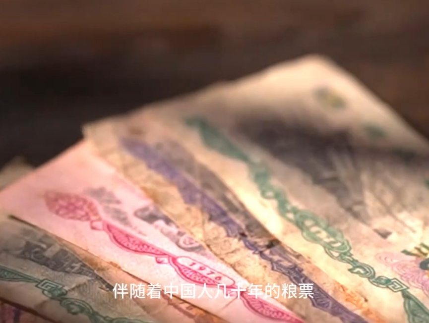继“三峡工程搬迁”、北京申办2000年奥运会等历史画面之后,又出现了几张粮票的特写镜头,画外音接着说道:伴随着中国人几十年的粮票正式退出历史舞台。