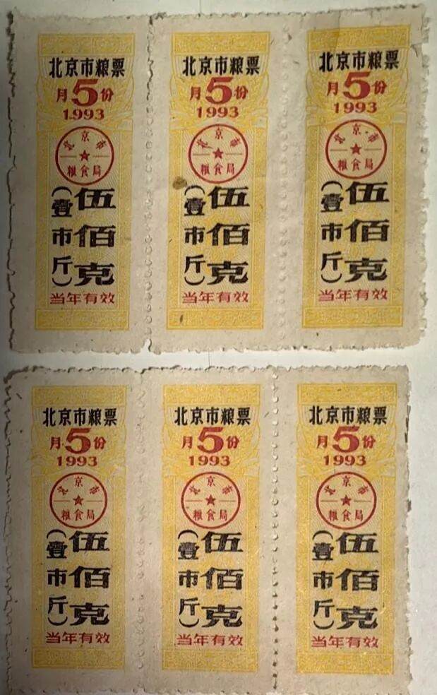 这张照片上的粮票,左边两竖排主要是上世纪六七十年代的粮票,右侧三竖排是北京市粮票,请注意:其票面时间主要是1992年、1993年,可称为“最后的粮票”。